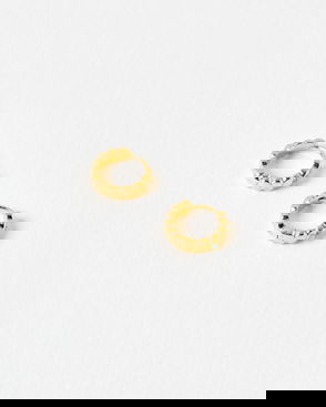 Three pairs of sterling silver earrings including molten-inspired hoops, blue opalite studs and clear gems studs.
