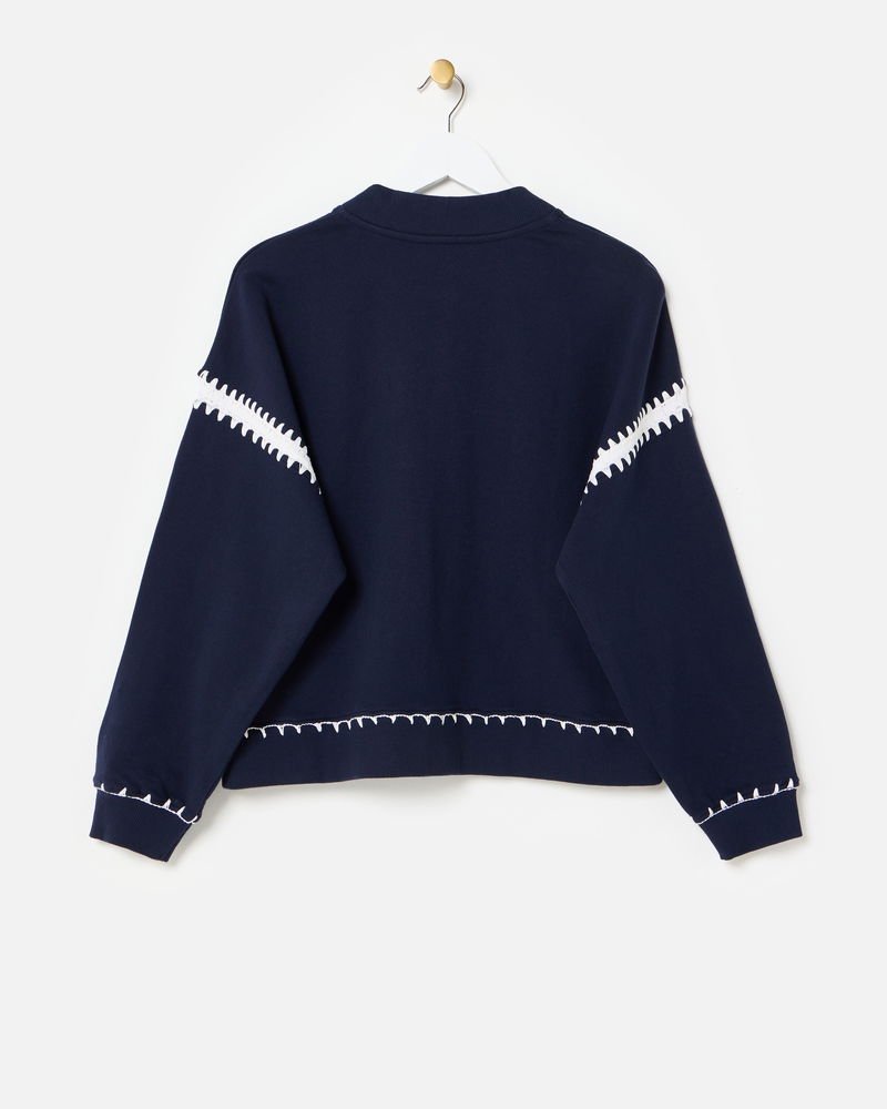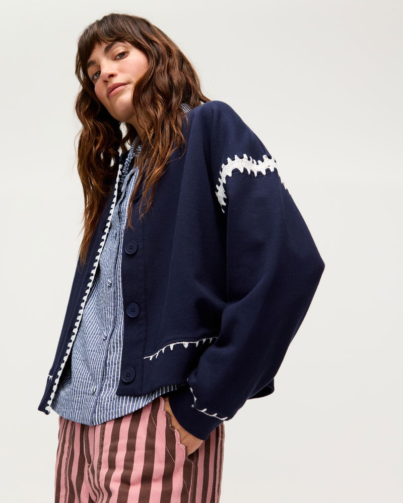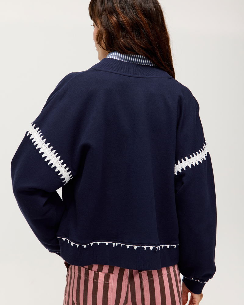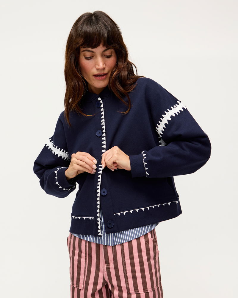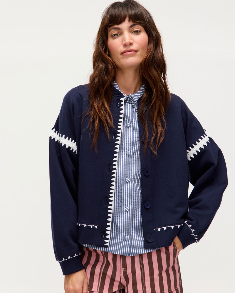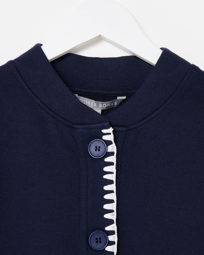 Navy Blue & White Crochet Trim Bomber Jacket