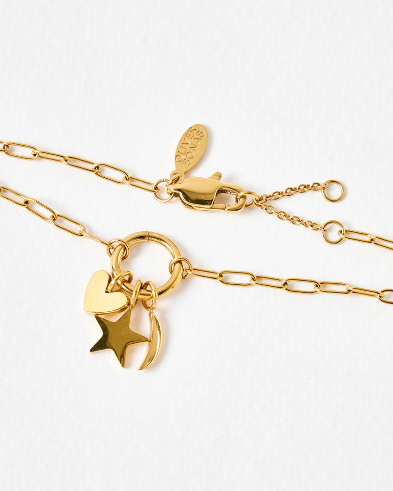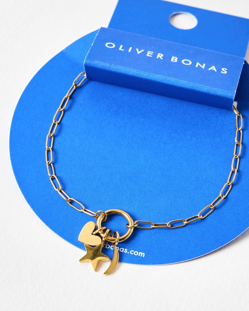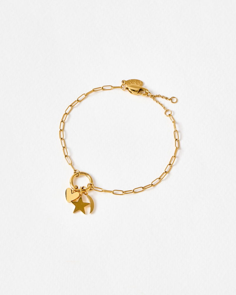 Nina Gold Tone Stainless Steel Waterproof Star, Moon & Heart Charm Chain Bracelet