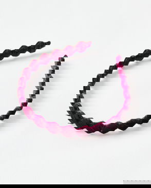 Slim black headband in a twisted shape embellished with a row of faux pearls.