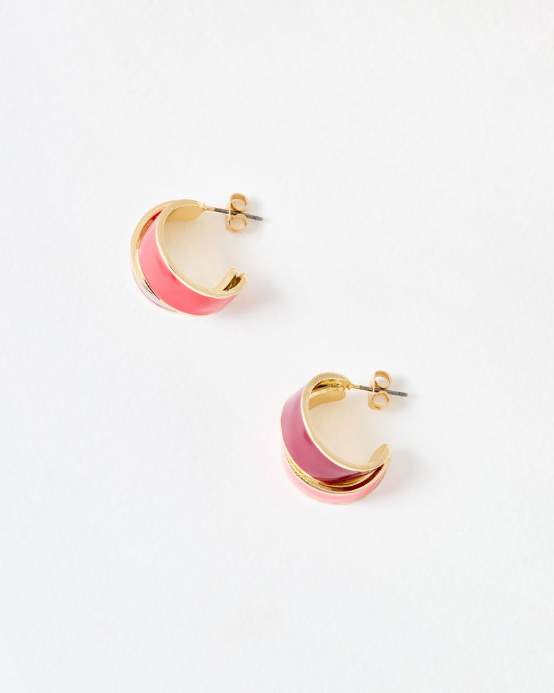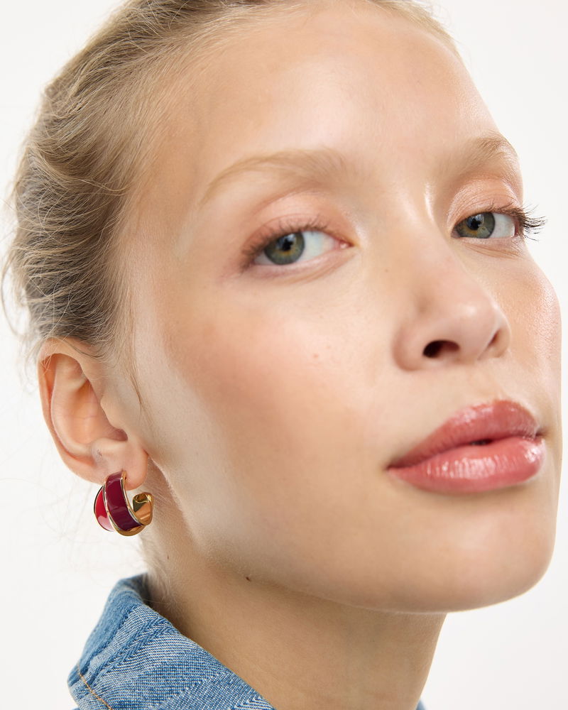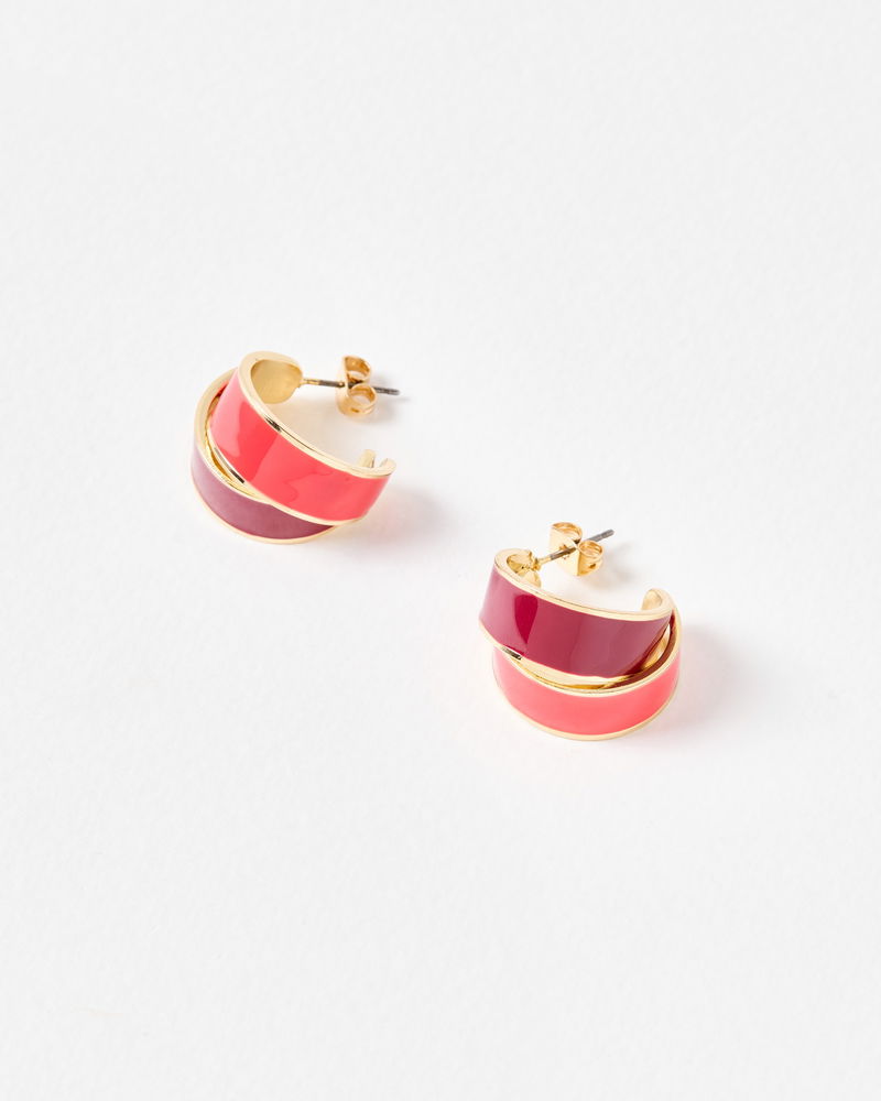 Designed with two curved hoops that overlap each other, we've used tonal red resin to add a colour pop to these hoop earrings. Finished with a shiny gold tone border, fasten easily with the butterfly back and stack with other gold studs.
