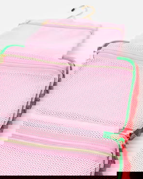 Medium sized makeup bag make from a soft pink velvet fabric, embellished with a large fabric bow on the front. Lined in a luxurious blue material with an inner pocket and blue tassel pull, use this wash bag to store essential toiletries and makeup on your dresser, in your bathroom, or on holidays. Makes for an ideal birthday or Christmas stocking filler treat.