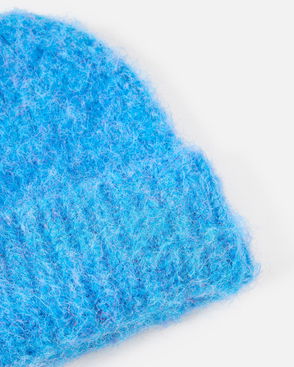 Black beanie hat knitted in a striped plated design with rainbow metallic yarn.