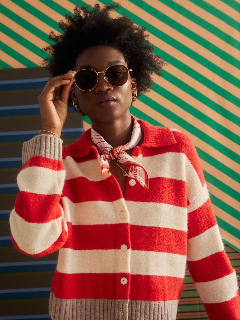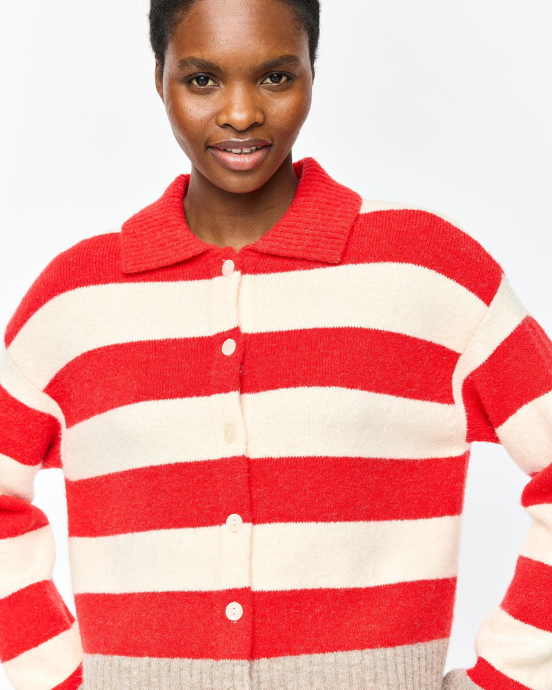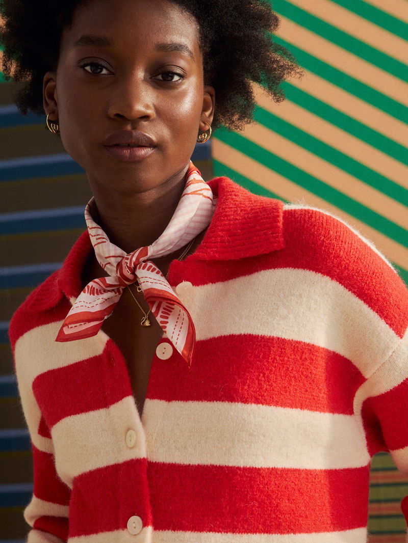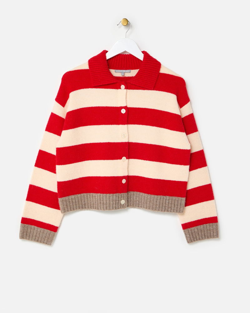 Looking for a cosy knit for layering up as the weather turns colder? Meet our red and cream striped cardigan featuring a collared neckline and brown ribbed trims. With pearlescent cream buttons down the front and a soft, fluffy finish, it's a go-to piece for transitional dressing.