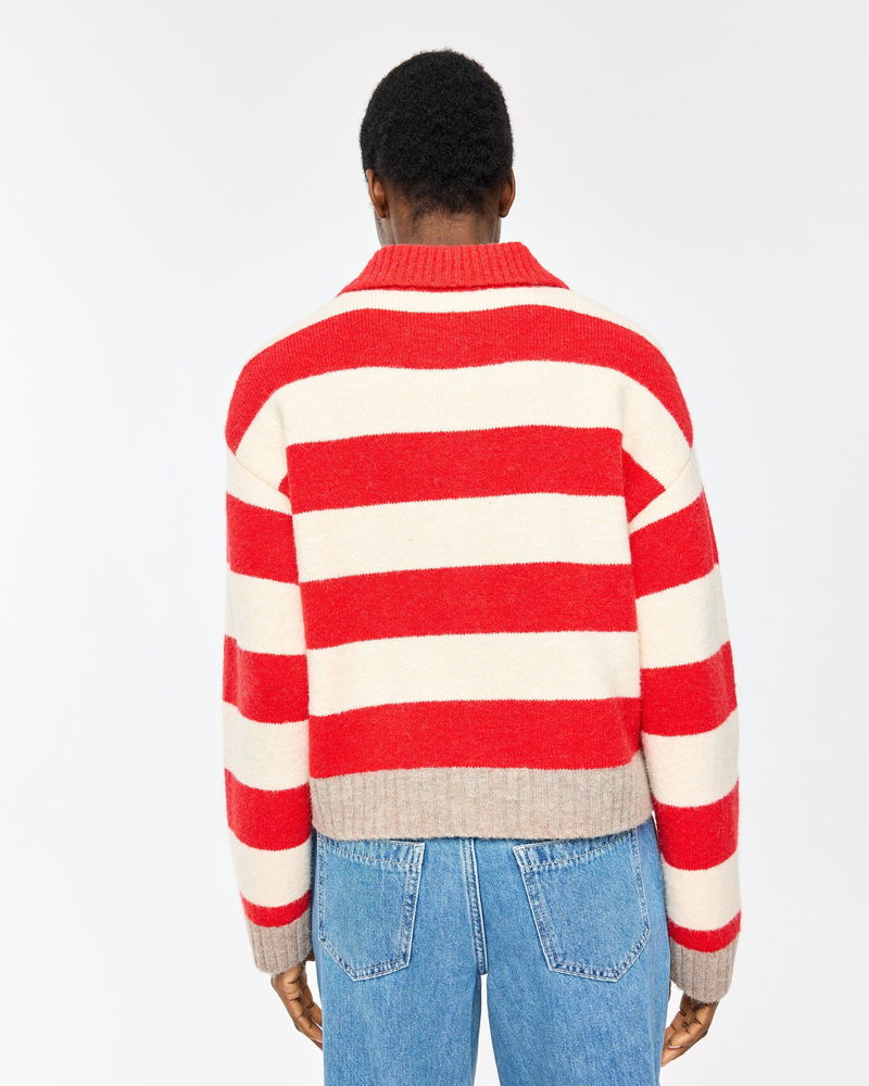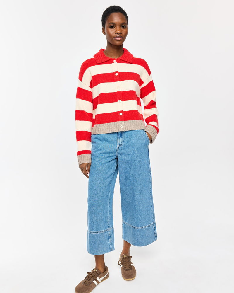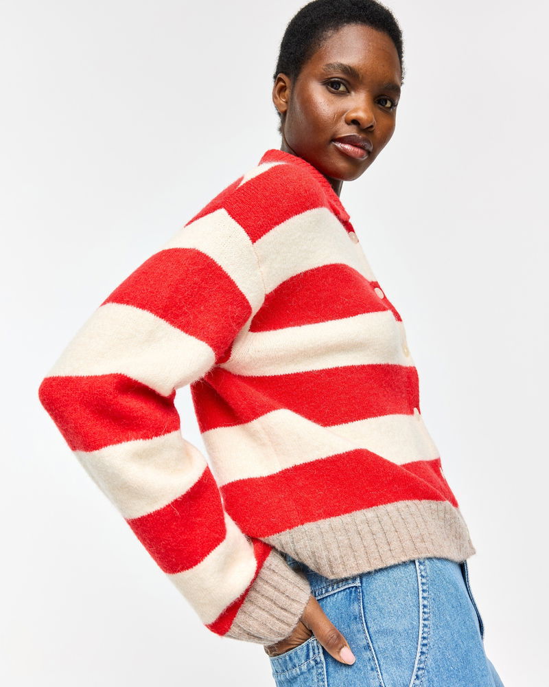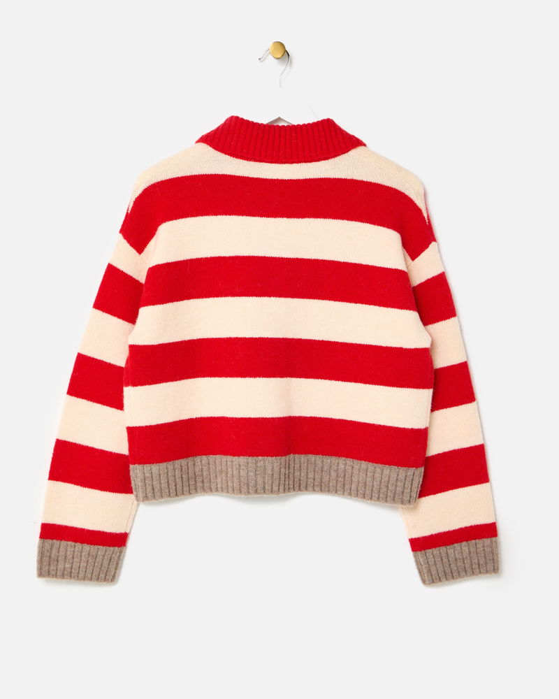 Looking for a cosy knit for layering up as the weather turns colder? Meet our red and cream striped cardigan featuring a collared neckline and brown ribbed trims. With pearlescent cream buttons down the front and a soft, fluffy finish, it's a go-to piece for transitional dressing.