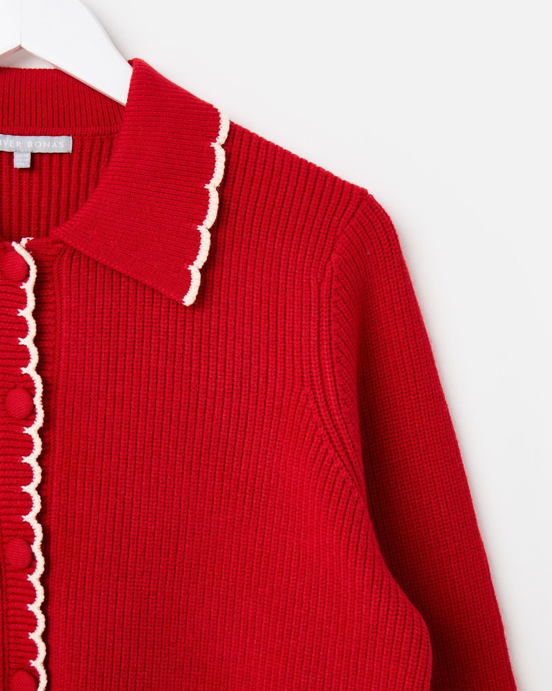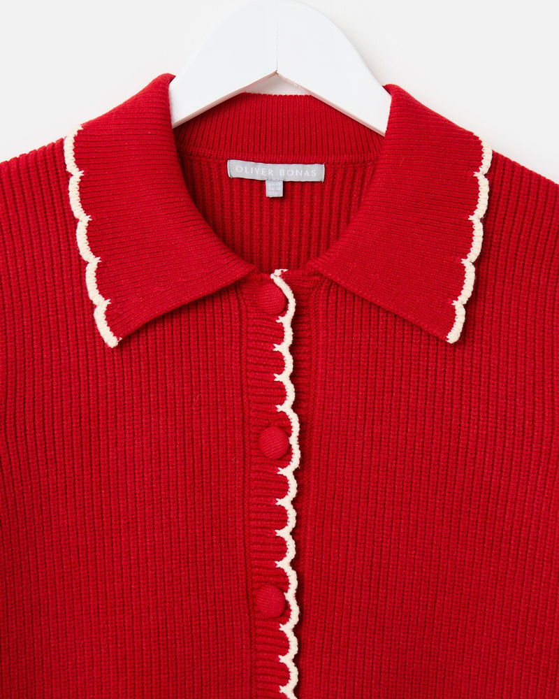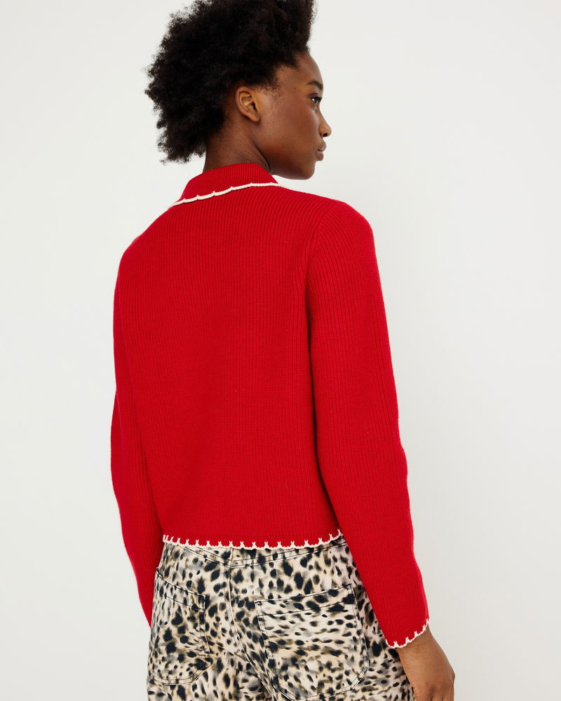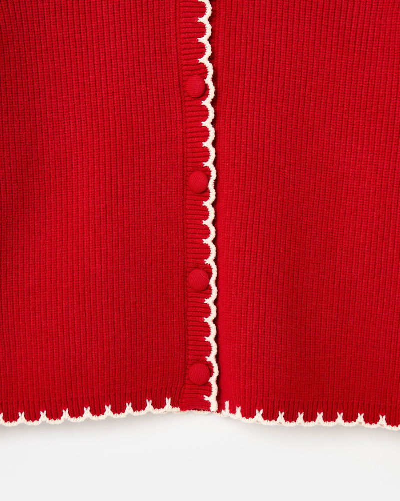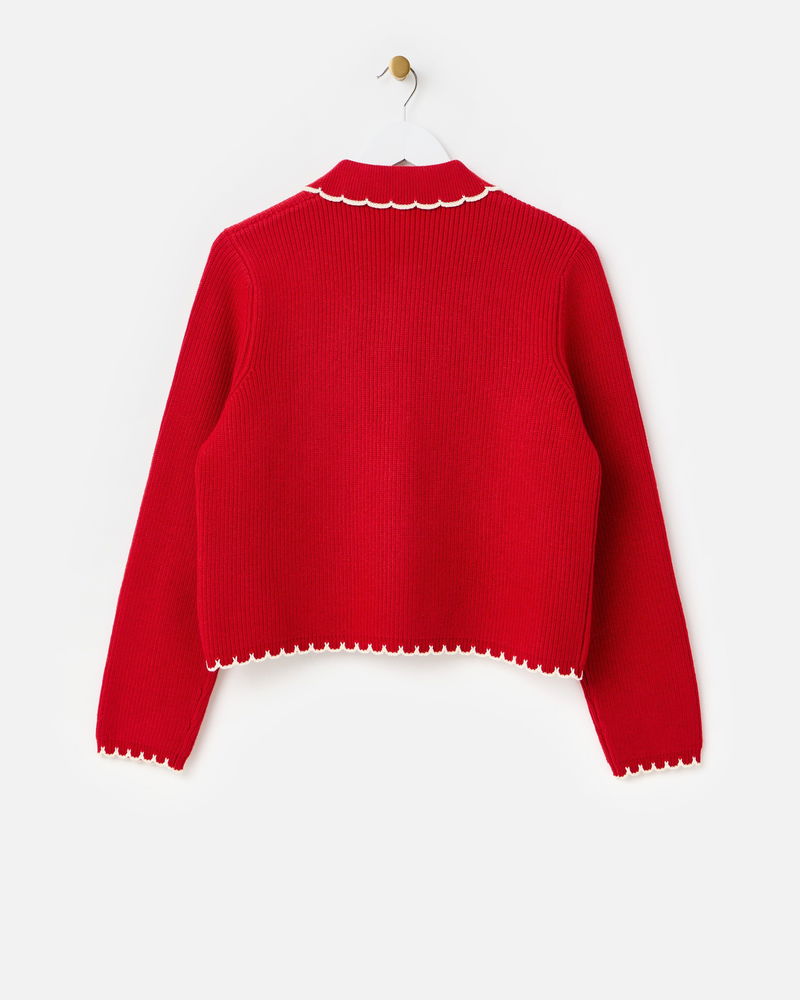 Red & White Blanket Stitch Collared Knitted Cardigan