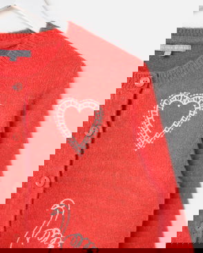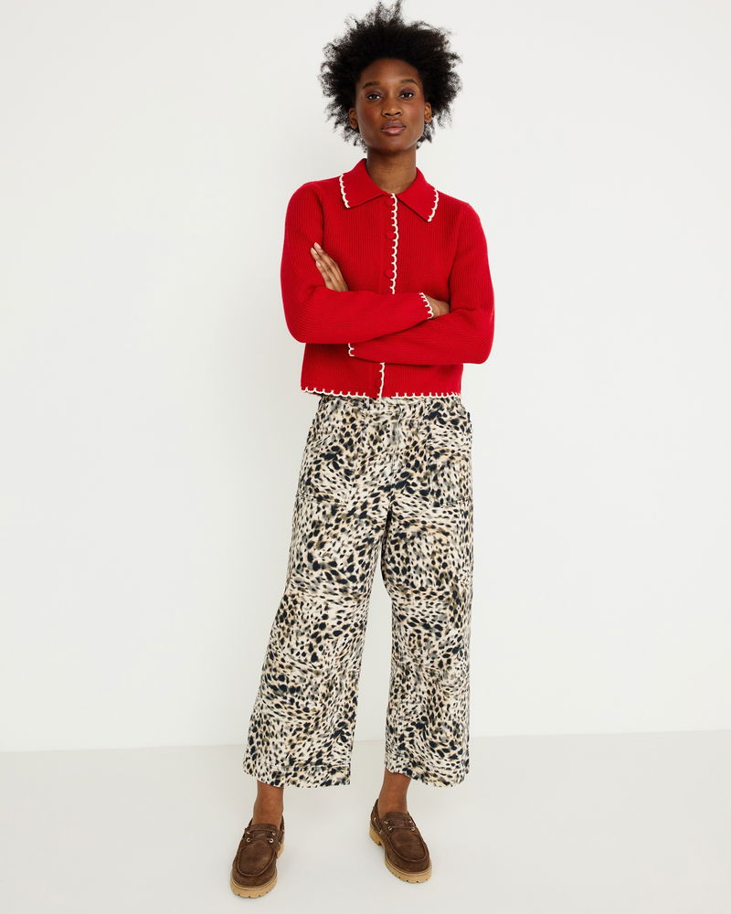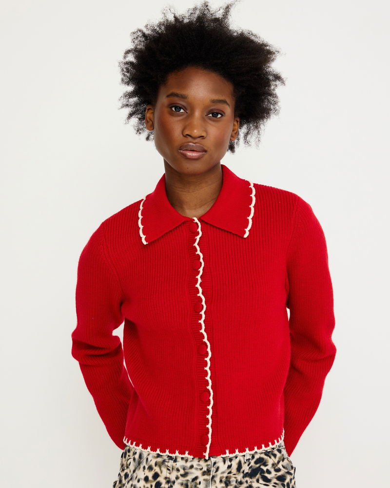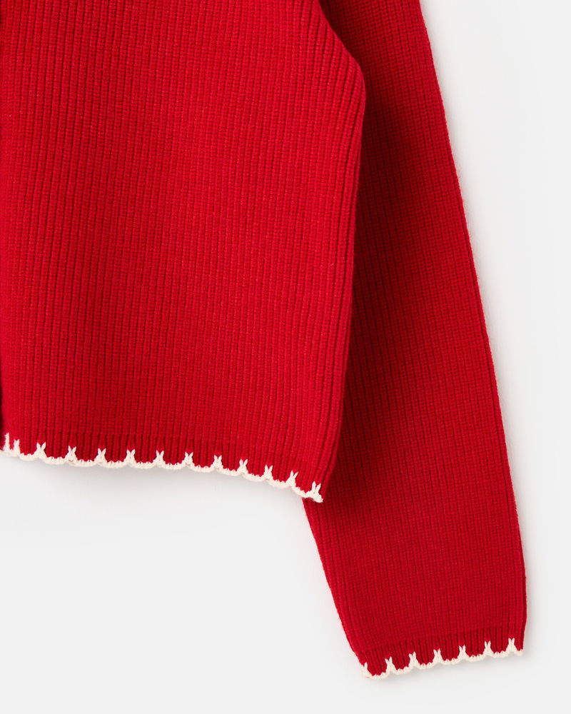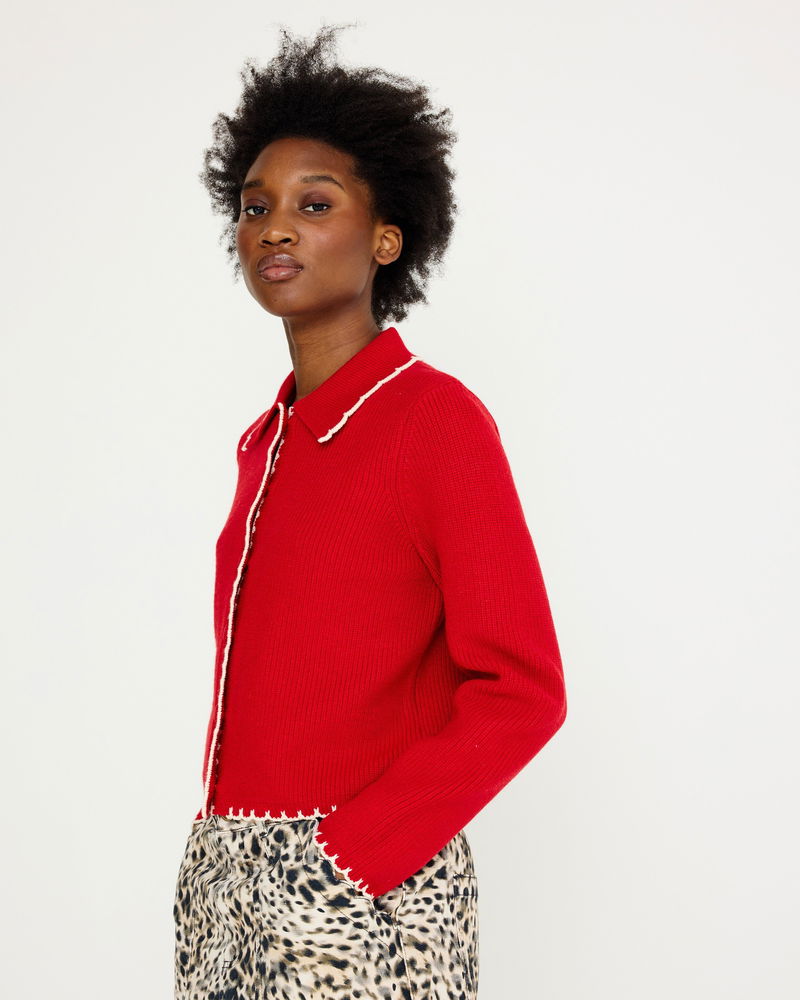 Red & White Blanket Stitch Collared Knitted Cardigan