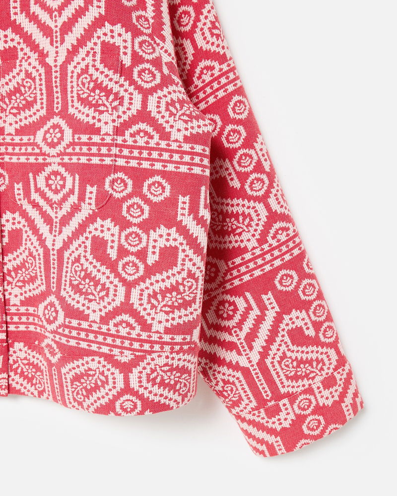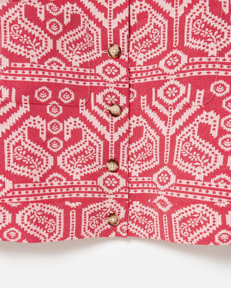 Our red jacket is woven in an eye-catching abstract print for a bold style statement. Made from 100% cotton, we've designed it with a collared neckline, tonal brown faux tortoiseshell buttons down the front and chest pockets. Wear it over a graphic tee and jeans for casual, daytime style or pair with the matching co-ord trousers for a coordinated summer-ready look. Part of a co-ord set. Pieces sold separately.