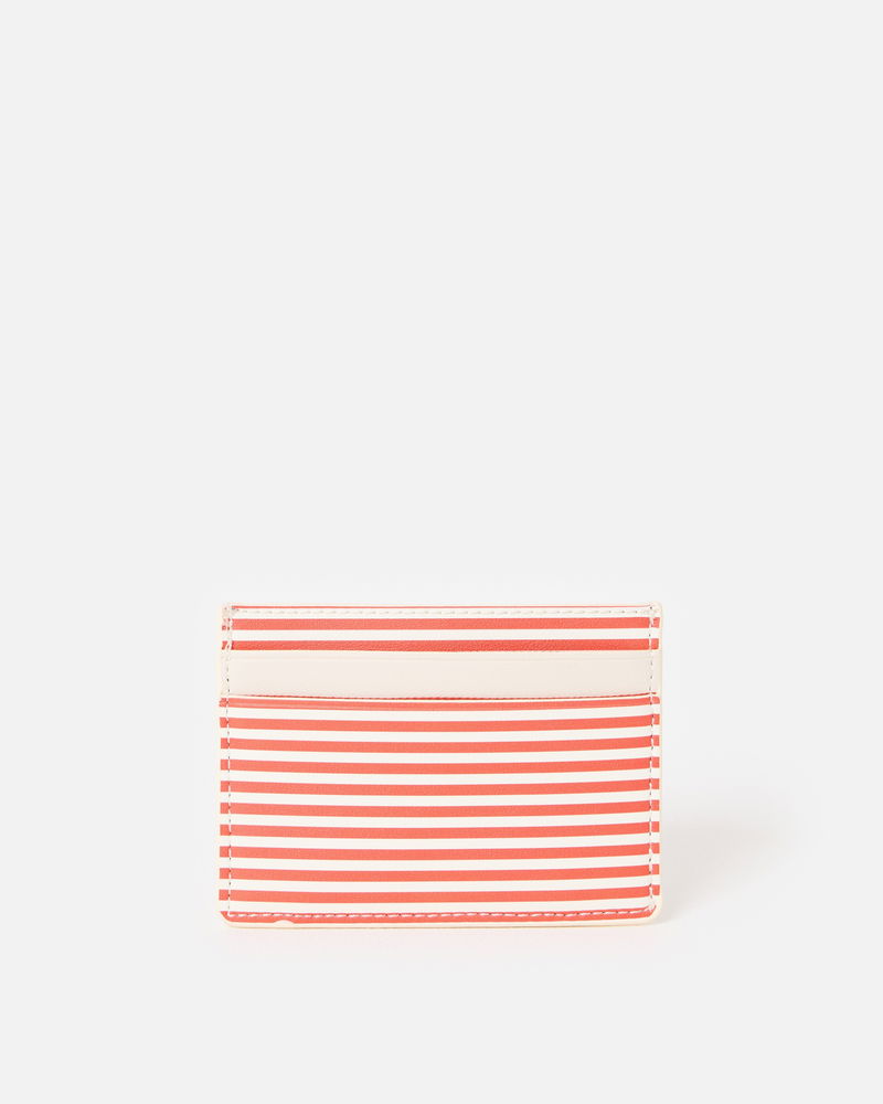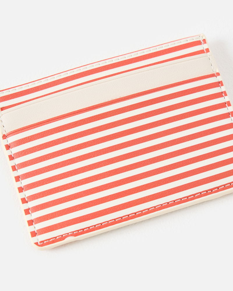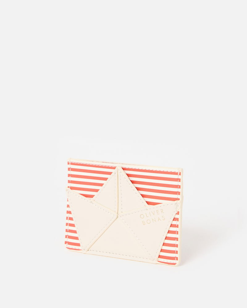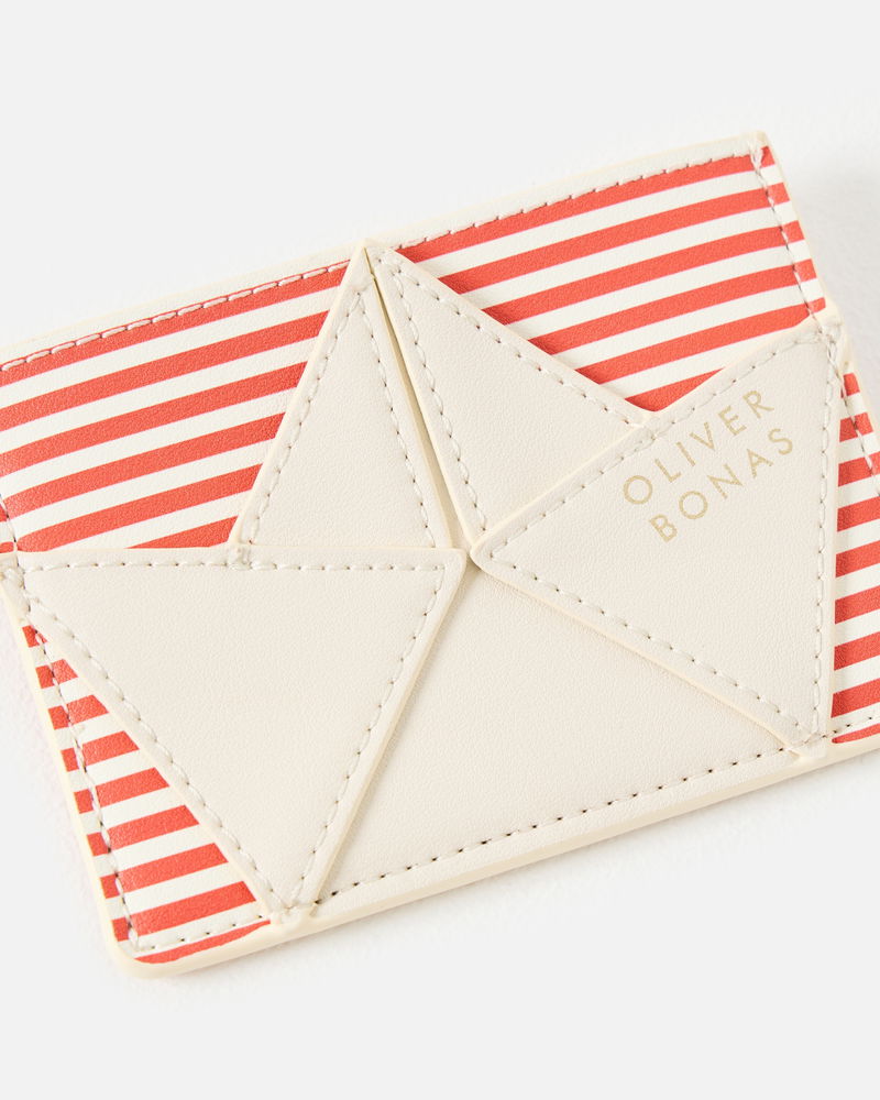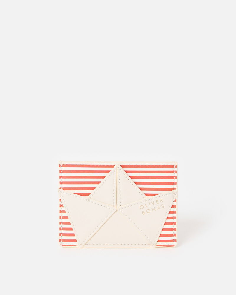 The red and white striped card holder features a playful paper boat design and alternating card slots on the back. With plenty of organisational space for your cards, it's complete with a gold Oliver Bonas logo on the front.
