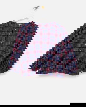 Red Gingham Shirred Puff Sleeve Collared Blouse