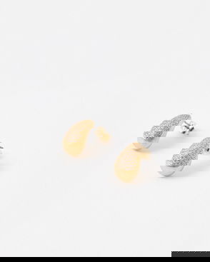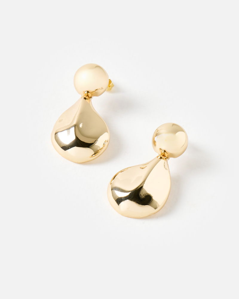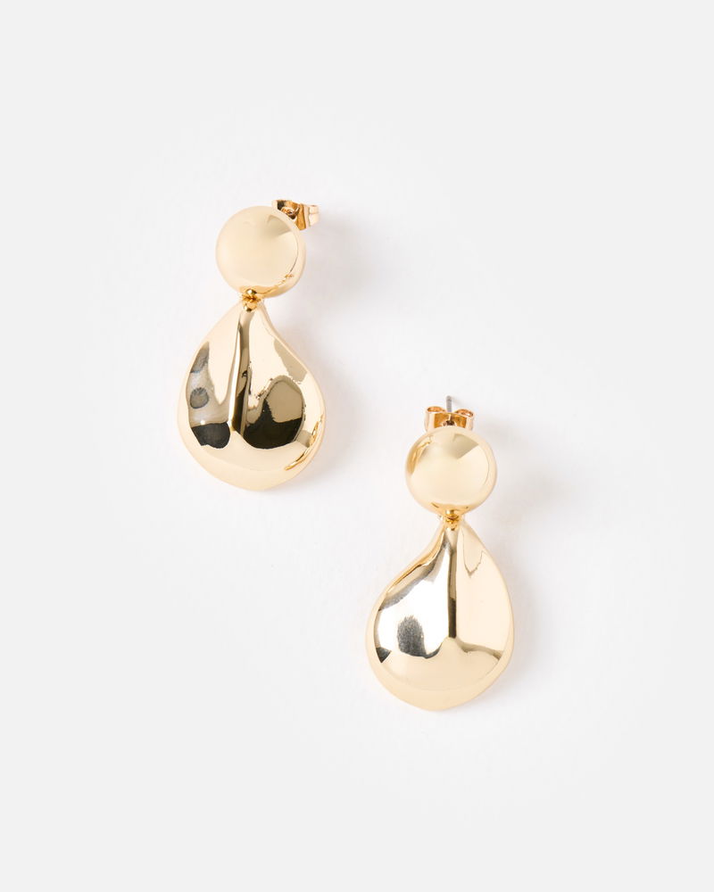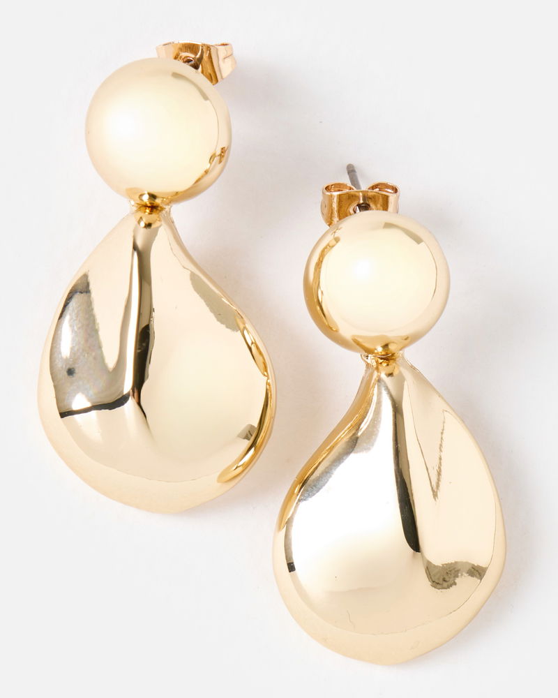 Gold tone stud earrings with a circular stud and large teardrop pendant. They've added an organic texture and high shine finish for maximum impact.