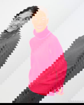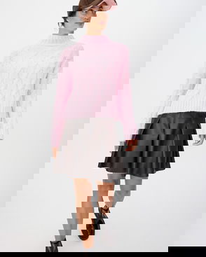 Orange jumper knitted in a cable pattern, with ribbed sleeves and subtle marl.