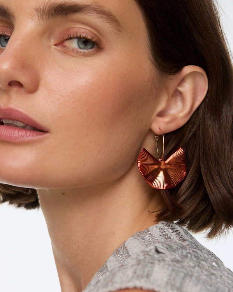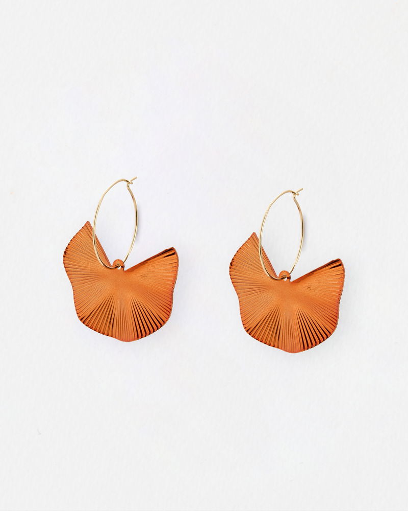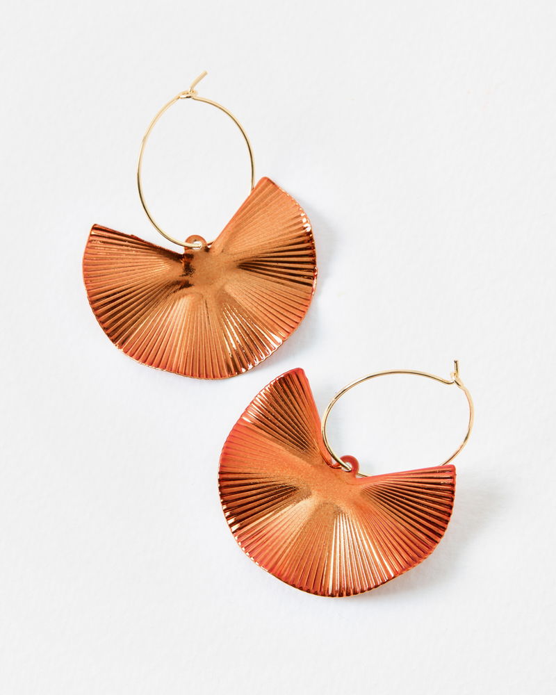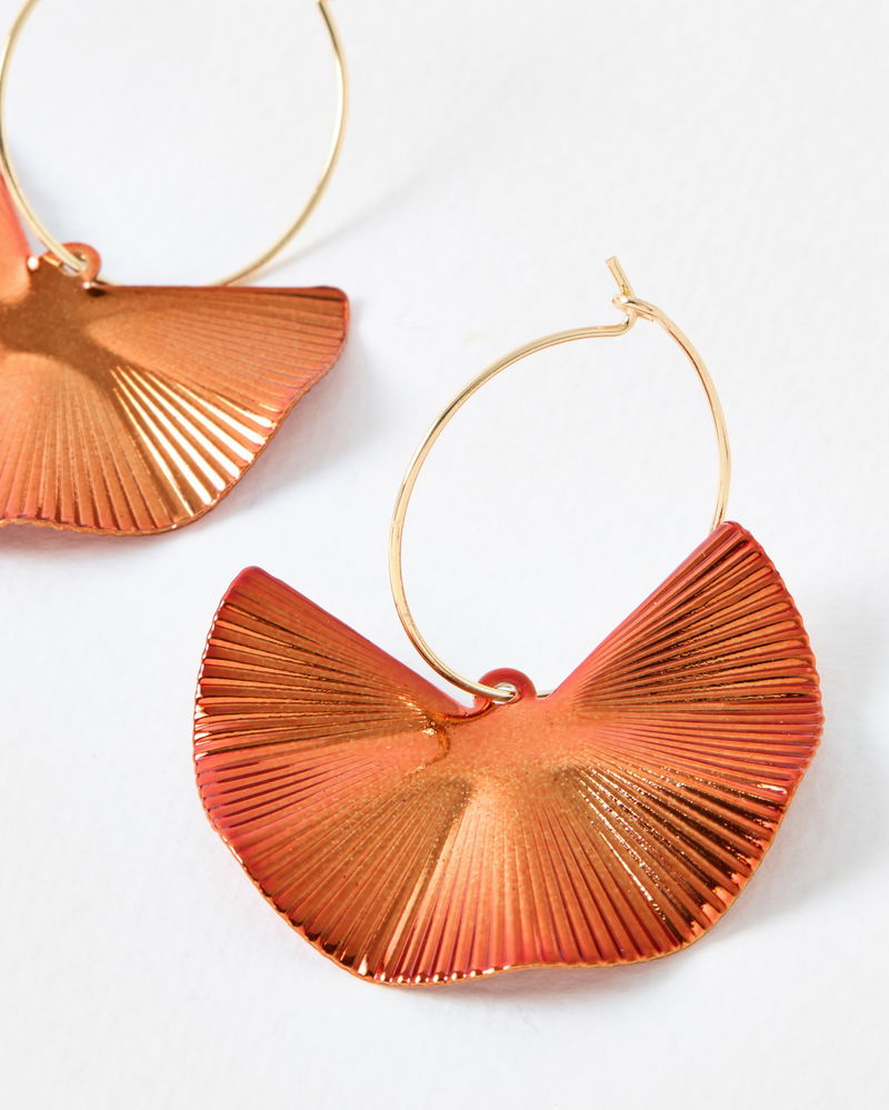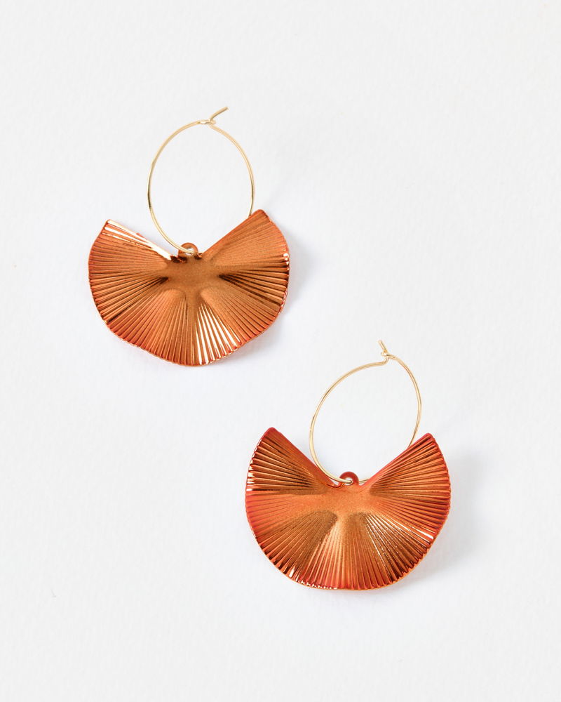 Designed with a slim hoop and thread through back, these statement earrings suspend a orange-toned semi circle engraved with intricate lines for a textured finish.