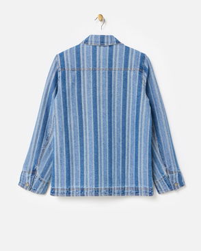 Cotton denim jacket in a light blue wash with a collared neckline and silver-toned buttons down the front. Designed with front pockets, a scalloped hem and a relaxed, boxy fit.