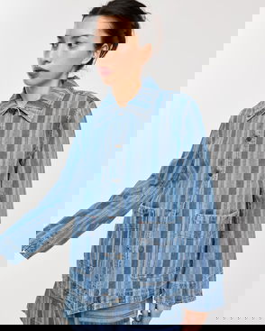Sleeveless denim jacket in a light blue wash, with silver-toned buttons and a scalloped hem and neckline. Designed with two front pockets with embroidered detailing and a relaxed, boxy fit.