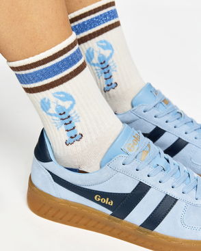 Sheer ankle socks knitted in a blue, green and yellow floral pattern with orange sparkly trims.
