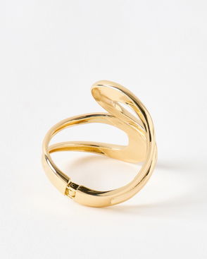 Chunky silver-toned cuff bangle in a large twisted style, and a smooth, shiny finish. Style as part of your silver bangle stack, or wear solo for a statement look.