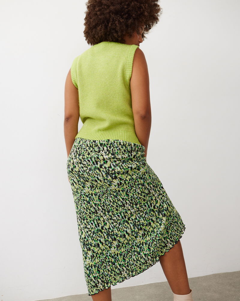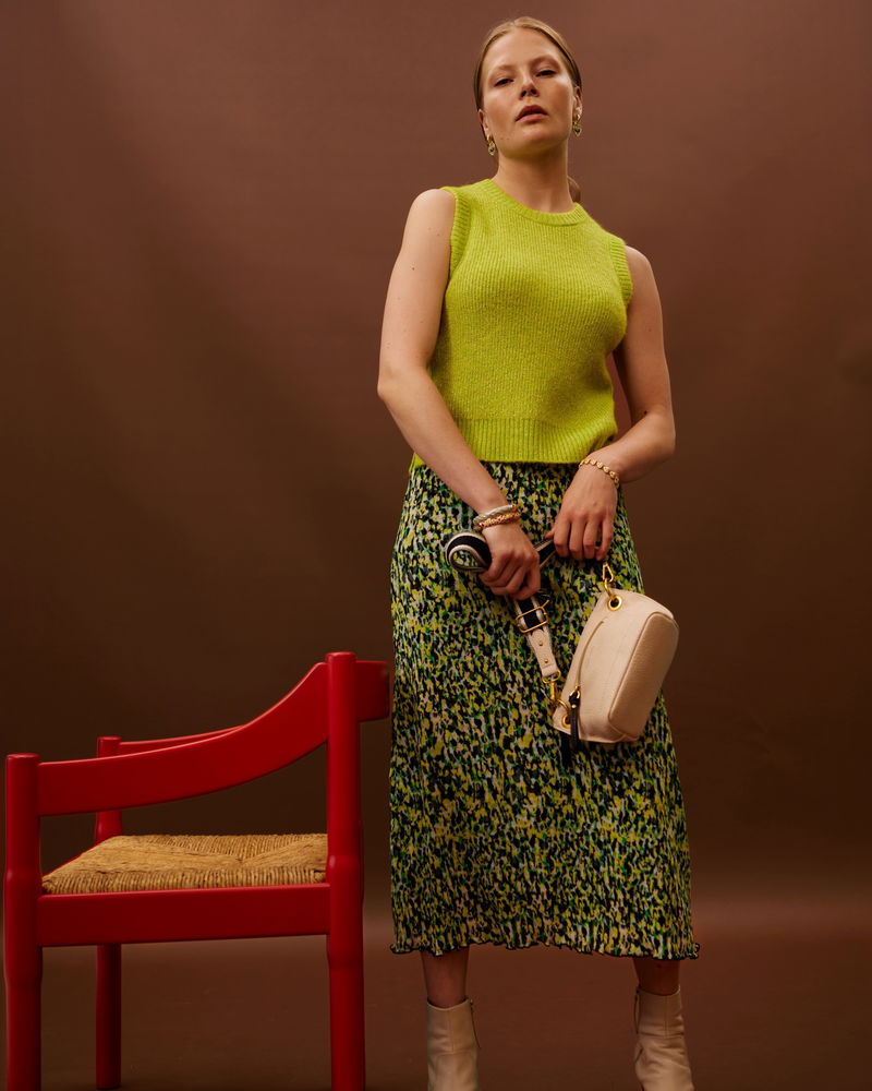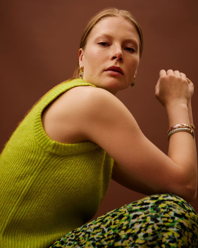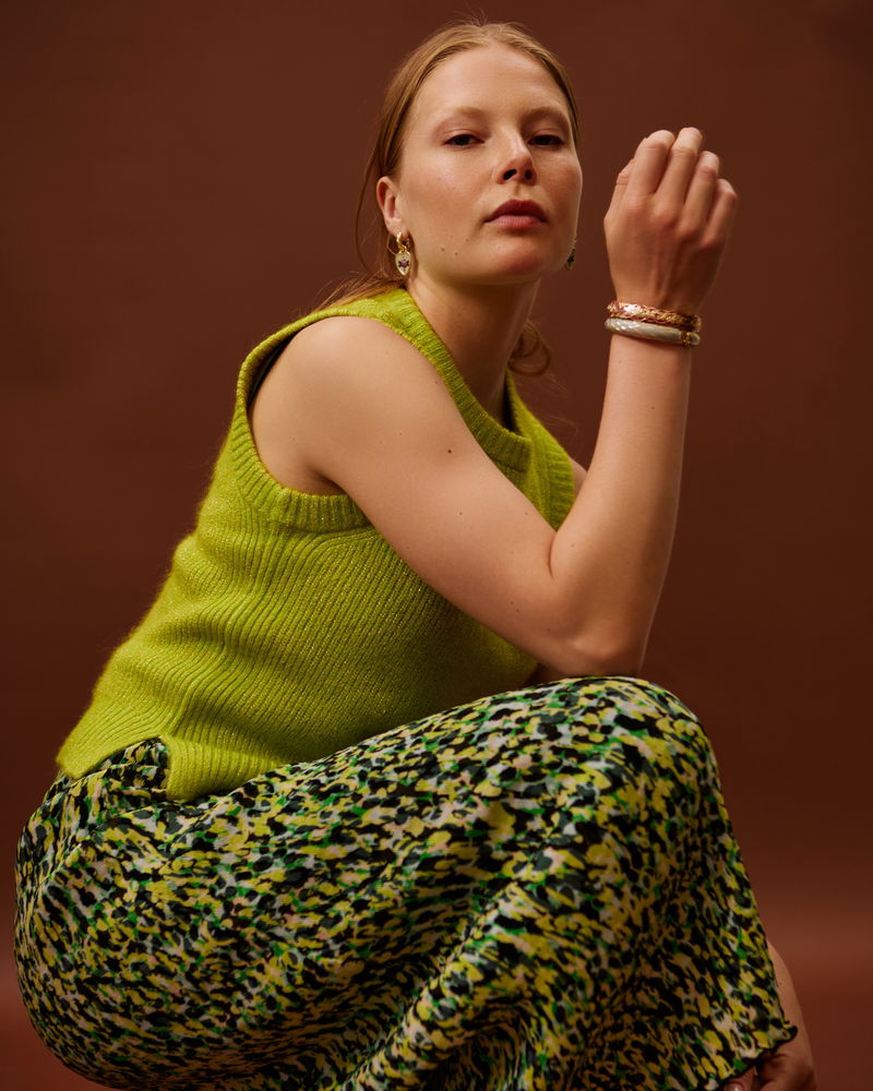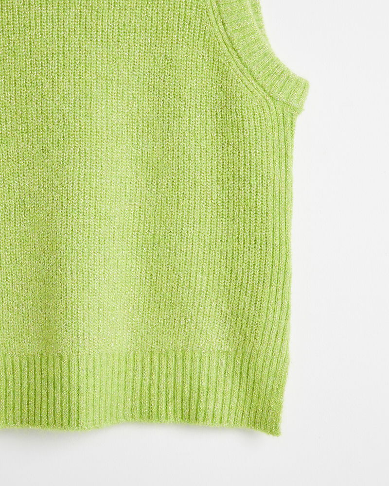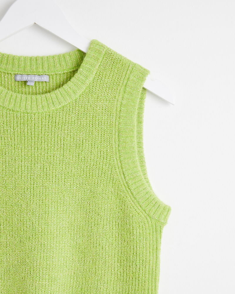 This knitted tank top sits in a fitted profile with ribbed trims. A subtle sparks sits among the neon green yarn.