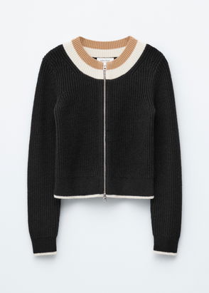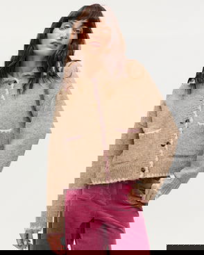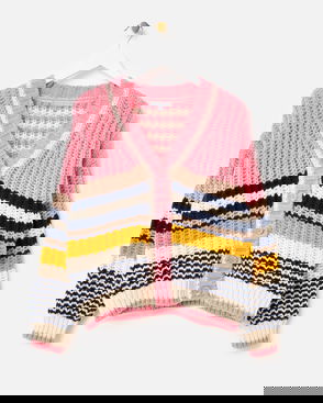 Pink zip up cardigan knitted in a stretchy rib pattern, with bobble edging and sparkly trims.