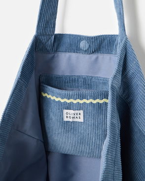 Green fabric tote bag in a light pink striped pattern with a yellow trim, with matching shoulder handles, an interior pocket and light pink embroidered Oliver Bonas text in a circular design. This roomy shopper bag is an ideal grab-and-go option to hold everything you need for the day.