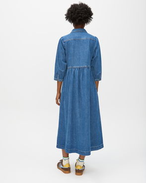 V-neck midi dress with a blue and light green striped pattern, pleated shoulders and balloon-style three-quarter length sleeves with elasticated cuffs. Designed with three matching fabric covered buttons down the chest, a hidden zip on the back and a gathered waist.