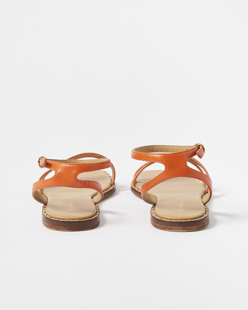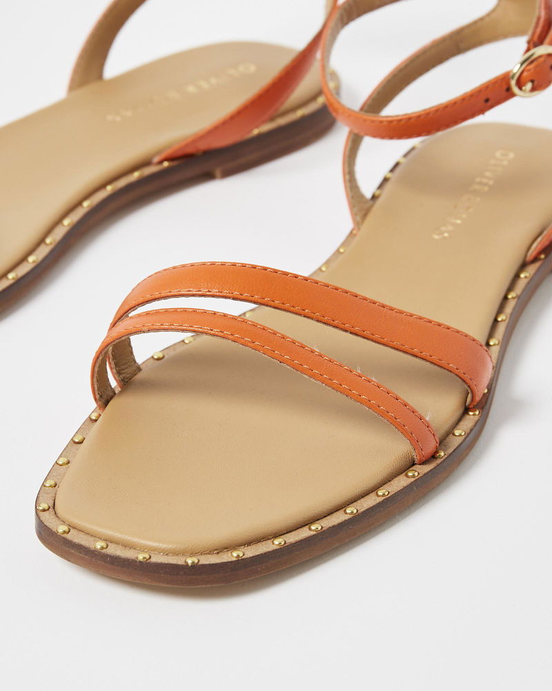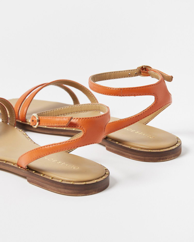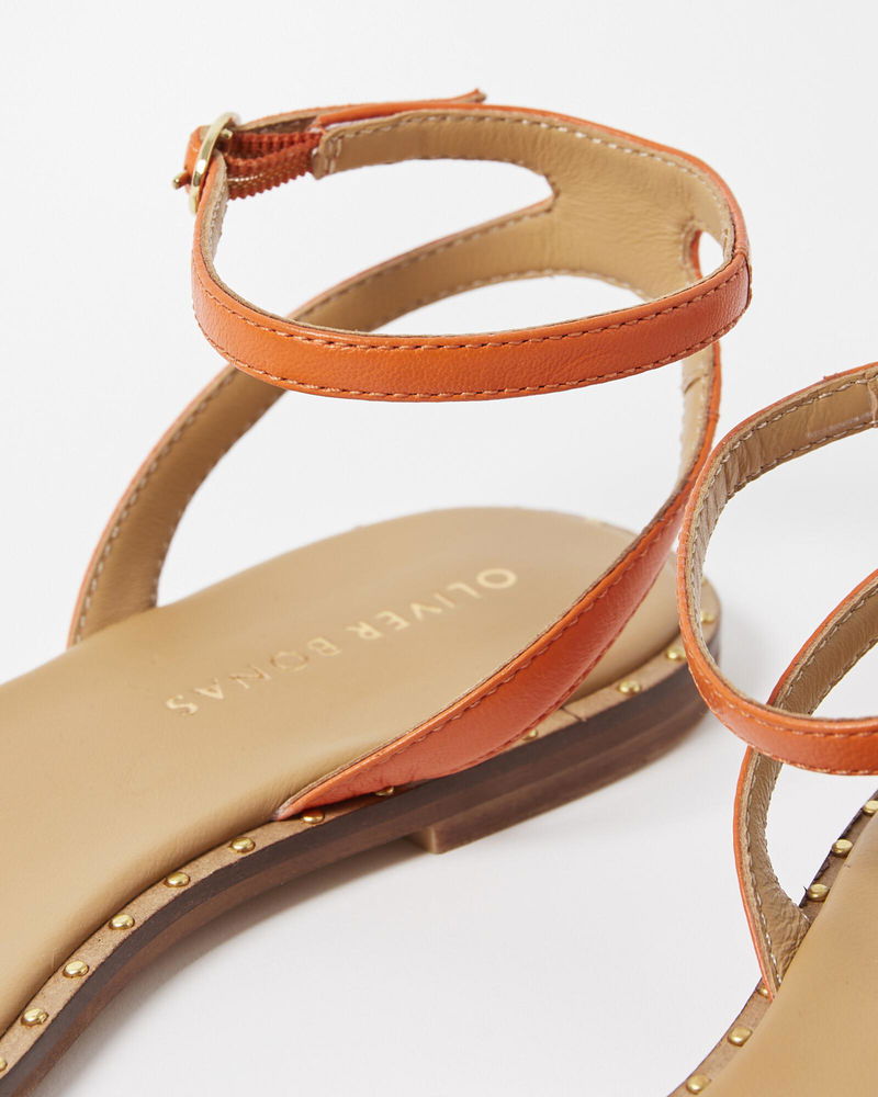 Golden stud details sit around the base, while an orange leather strap fastens around the ankle for a comfortable fit.