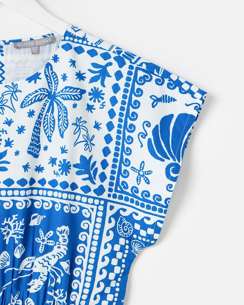 Looking for an outfit that combines daytime ease and summer charm? Introducing our blue and white Santorini-inspired midi dress. Designed with a tile-inspired pattern that was painted by hand in the OB creative studios, the playful print features fun horse, shell, sun and palm tree motifs for a little tropical, ocean-side charm. Featuring an open back detail secured by two matching buttons, wide-cut sleeves that drape over the shoulders and a gathered skirt for a breezy, relaxed fit. Made from breathable, lightweight cotton, this dress is the ideal choice for warm-weather styling.
