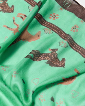 Green open collar shirt in a textured sheer fabric with a subtle embroidered floral pattern and two front pockets on the chest. Designed with short sleeves, small iridescent buttons in a pearlescent finish down the front and a relaxed, boxy fit.