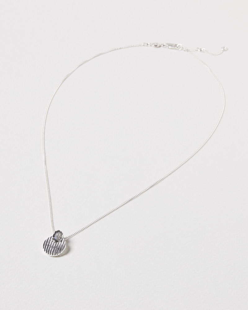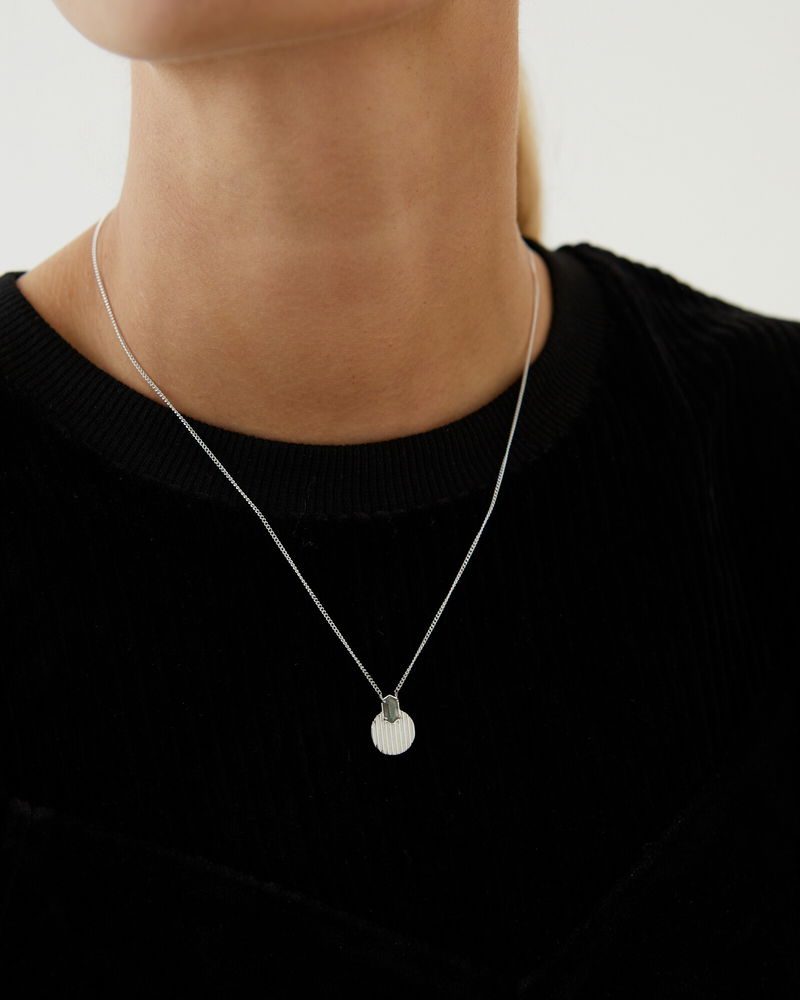 An engraved silver disc features a simple stone inlay, all on a dainty chain necklace.