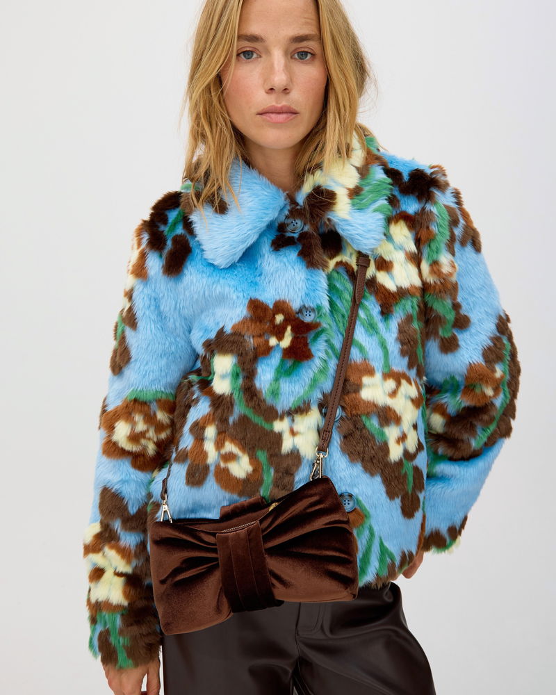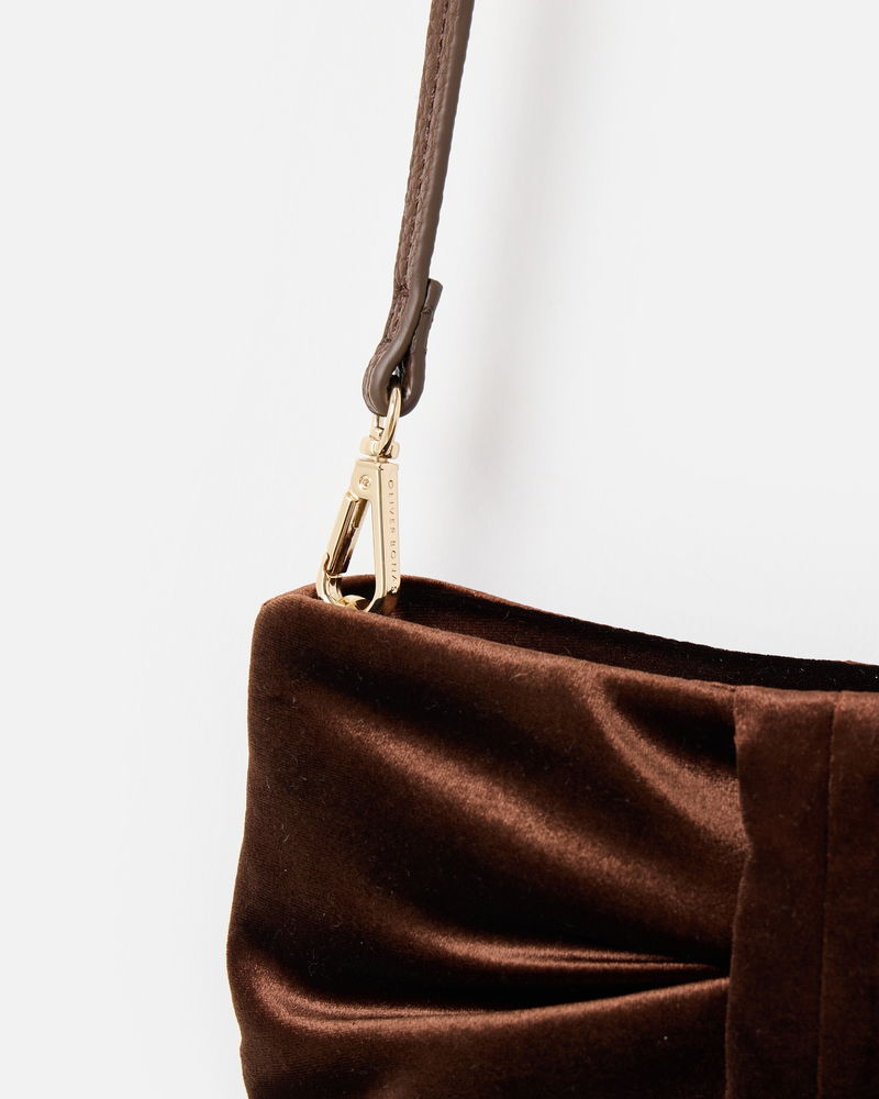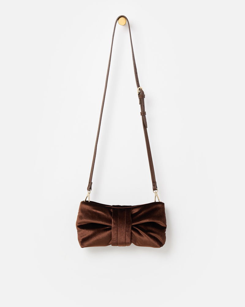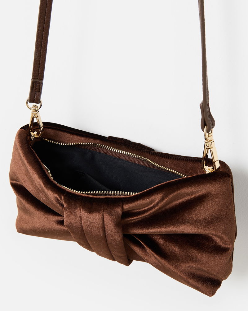 Made from soft chocolate brown velvet, our clutch bag is the perfect accessory to complement your Christmas party outfits. Designed in a playful bow shape with a gold zip closure, the interior features a black fabric lining and slip pocket to keep your small essentials separate. Complete with a slim, adjustable crossbody strap which can be removed to carry as a clutch for alternative styling solutions (a girl needs options).