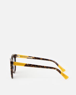 Angled square sunglasses with brown tinted lenses, a faux tortoiseshell frame that transitions into orange and wide arms.