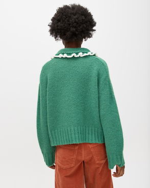 Lime green knitted jumper in a fluffy finish, with a v-neckline and ribbed detailing along the hem and cuffs.