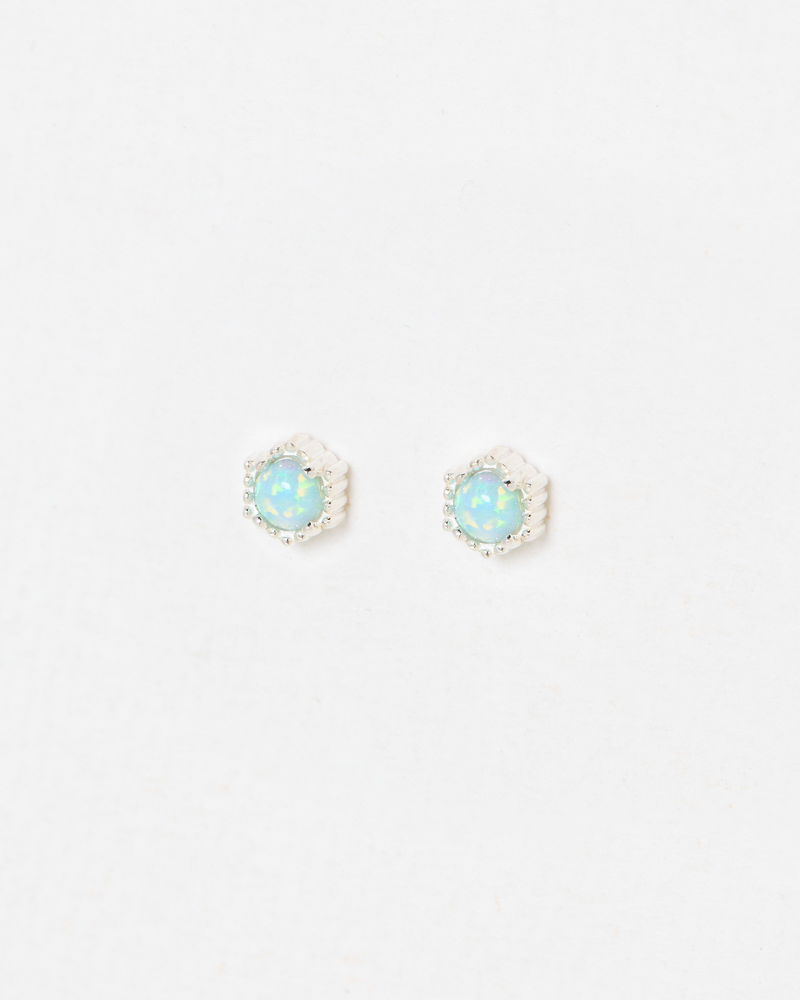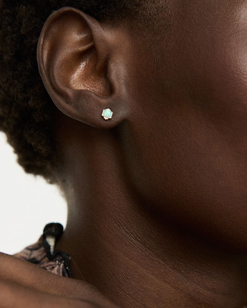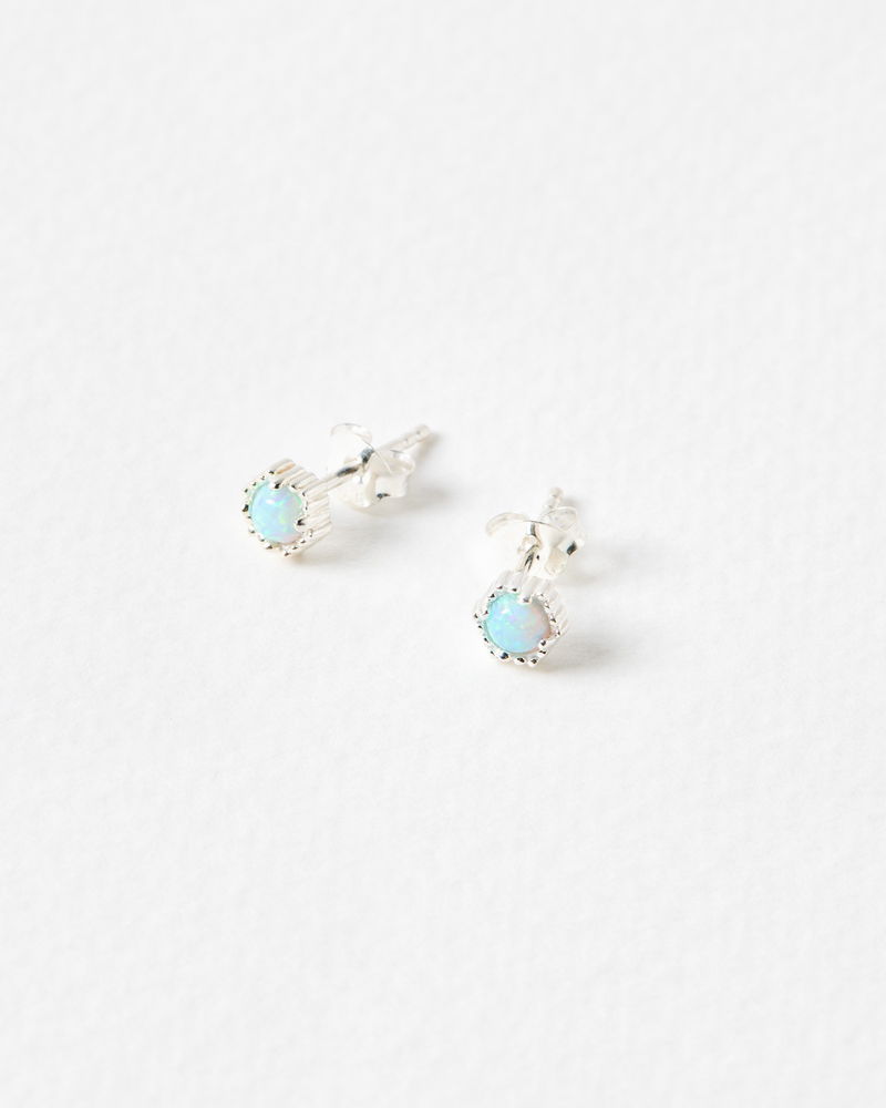 Sterling silver stud earrings with a blue opalite stone that catches the light and simple butterfly back. Wear solo or as a stacking earring in a second piercing.