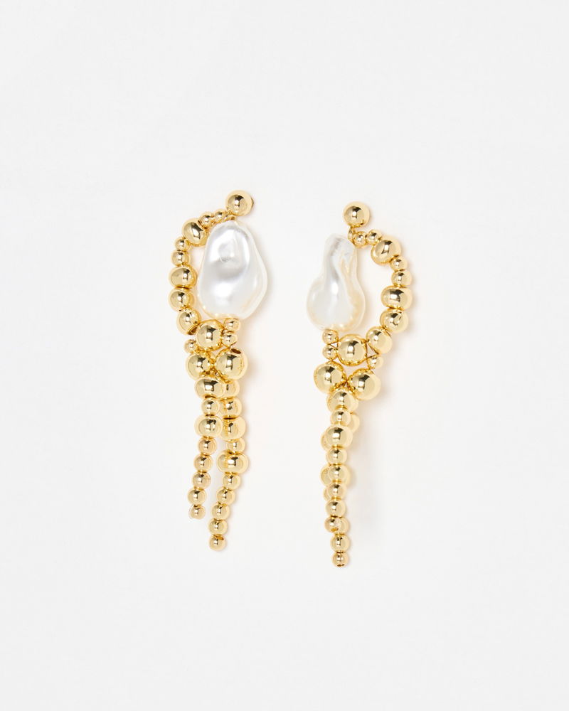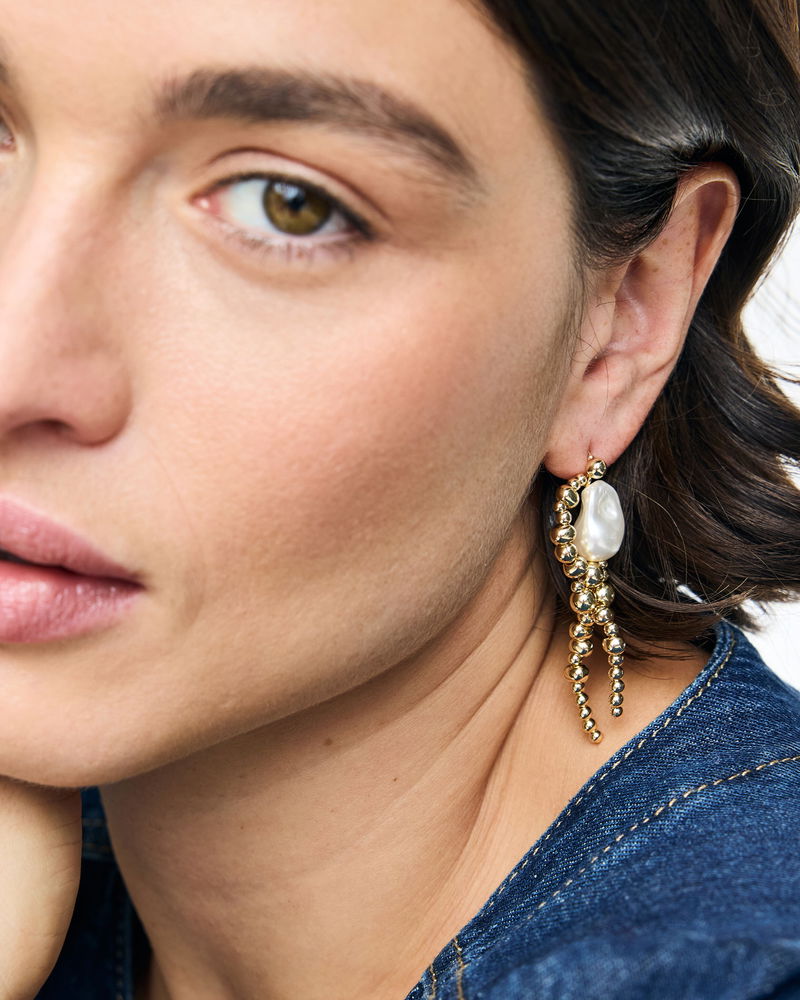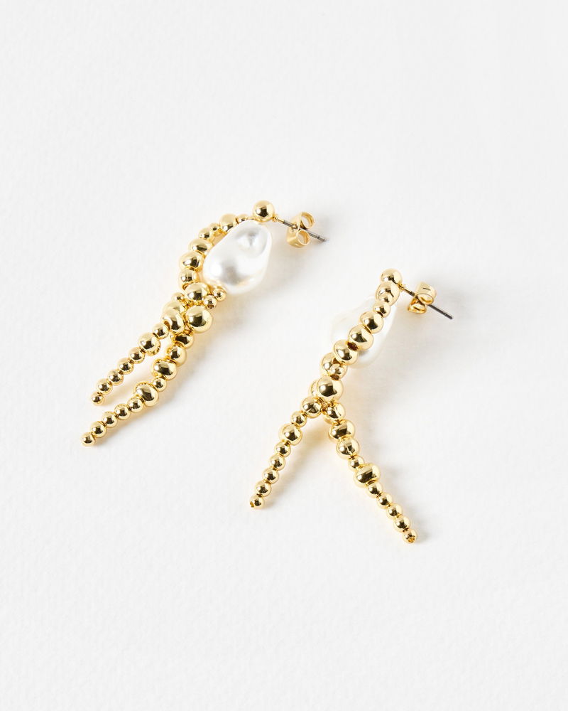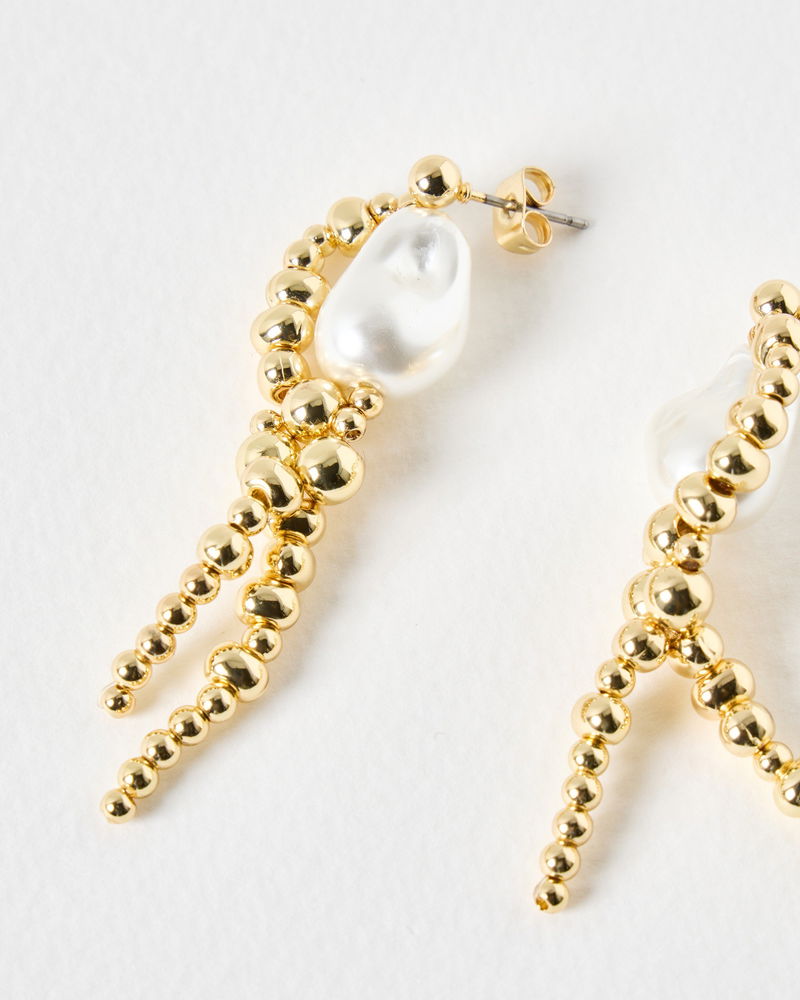 Gold tone drop earrings designed with a beaded drop tassel and large faux pearl. With an easy butterfly back, wear solo for mazimum impact.