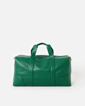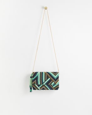 Green metallic clutch bag with a chunky ruched handle and magnetic flap opening. Wear as a clutch or use the slim crossbody strap.
