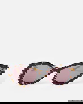 Round sunglasses with wavy, rimless lenses and gold metal arms.