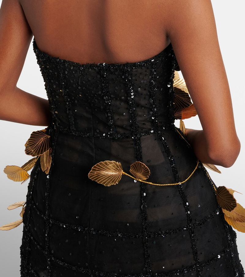 Oscar de la Renta's designs bring the beauty of nature to ready-to-wear. This elegant fit-and-flare cocktail dress is cut to a strapless, mini-length silhouette with all-over shimmering sequins and intricate gold-toned leaf embellishments.