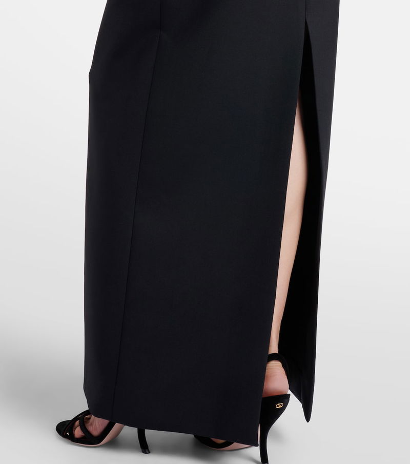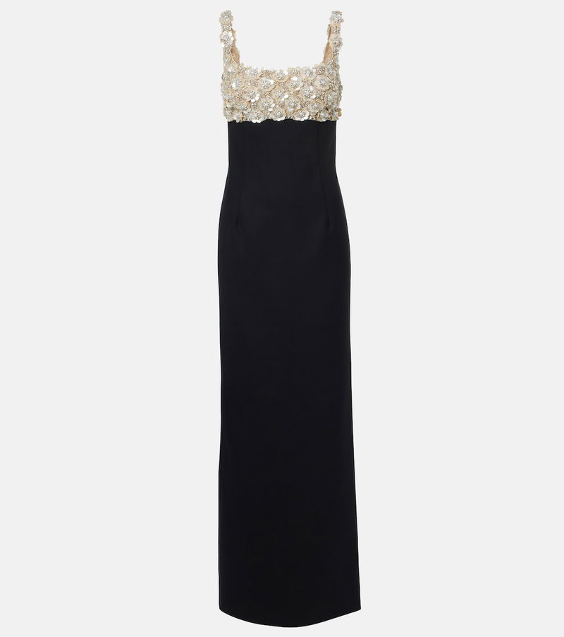 Oscar de la Renta can always be relied on for unequivocally glamorous designs. This bustier gown is a column silhouette and features floral-shaped pearl and shell embellishments at the bodice.