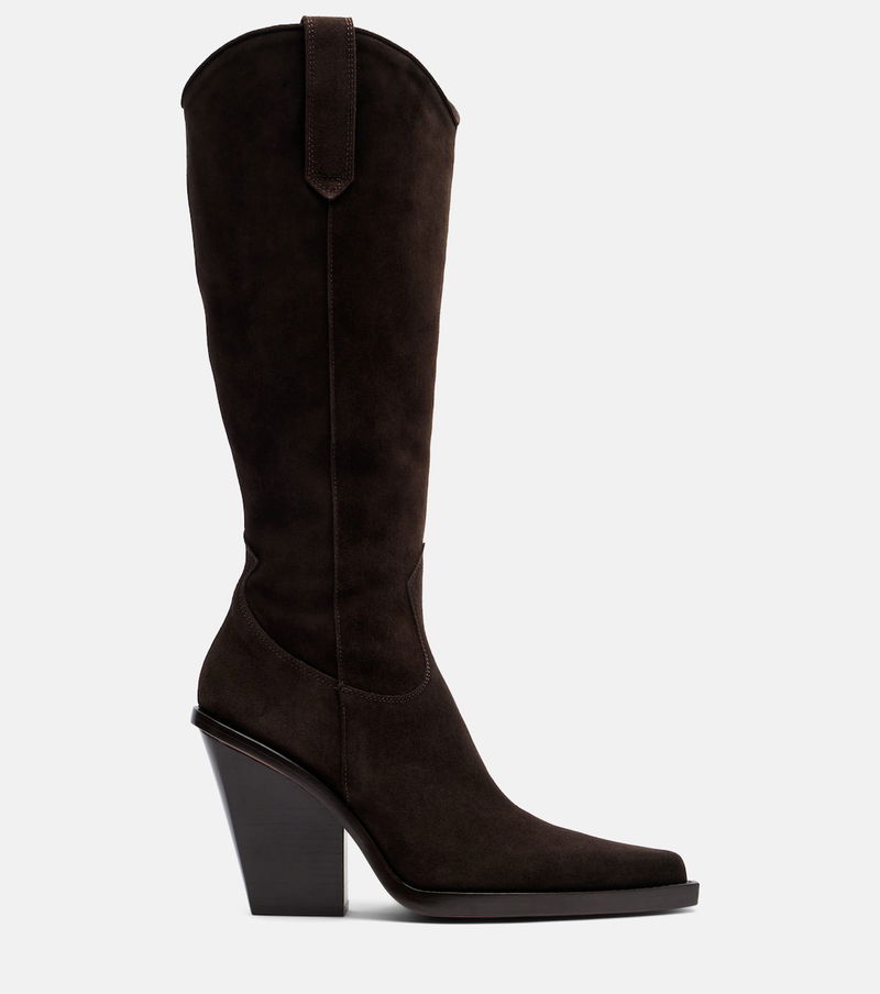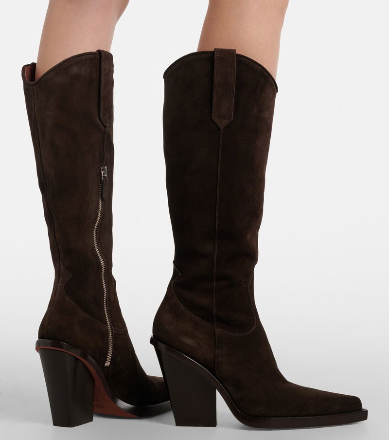 Paris Texas is an Italian shoe label that embodies the idea of contrasts. Made from brown suede, the Vegas cowboy boots sit atop 100mm flared heels and boast sleek pointed toes.