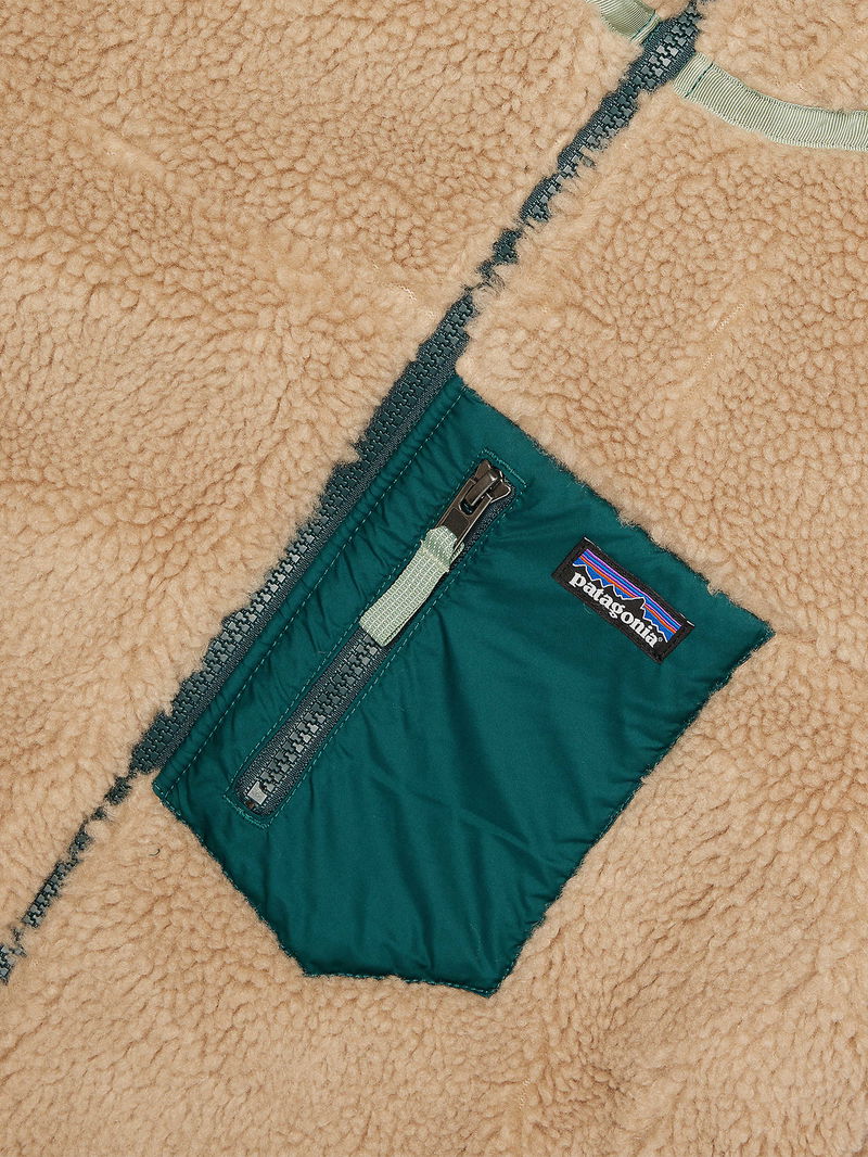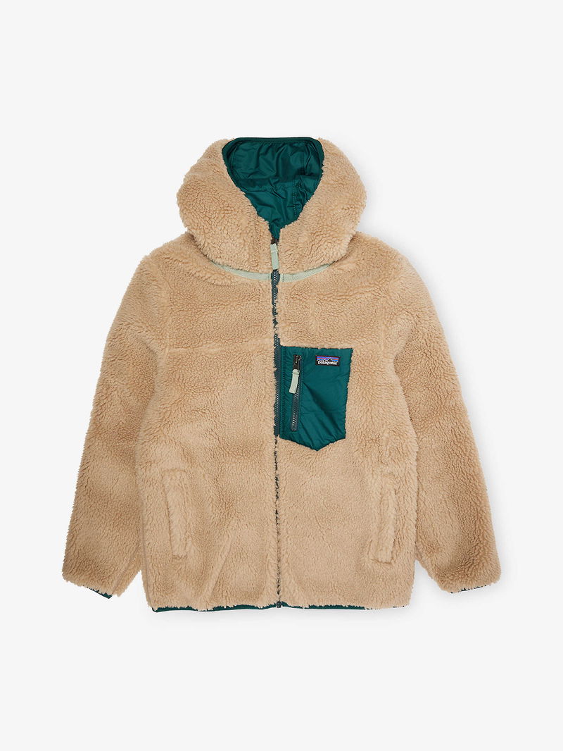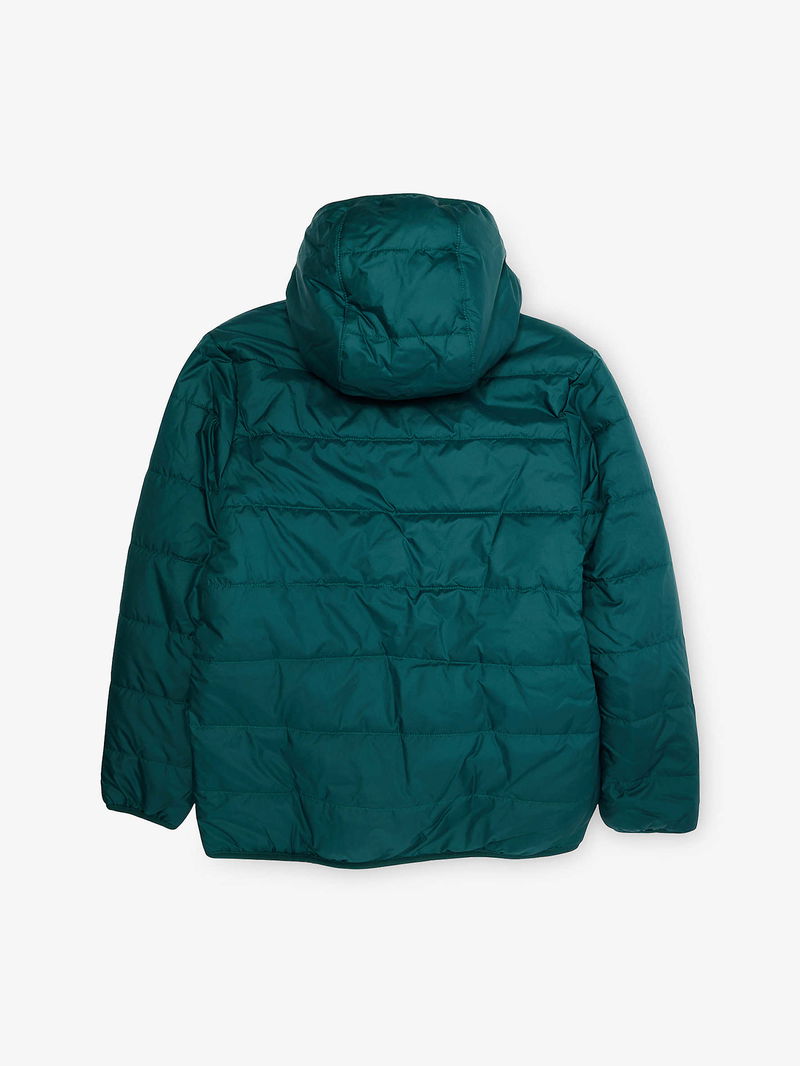 Patagonia woven hoodie. Regular fit, high-neck, hood, long sleeves, brand patch and two welt pockets at front, all-over quilted, internal fleece texture, reversible, elasticated trims.