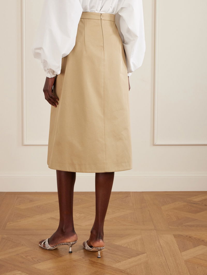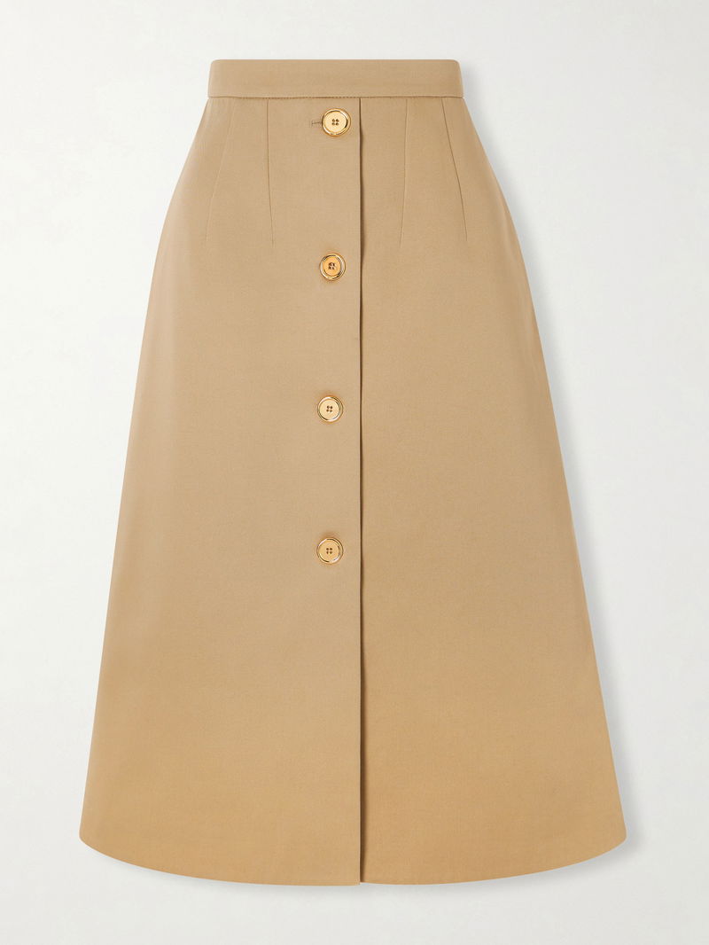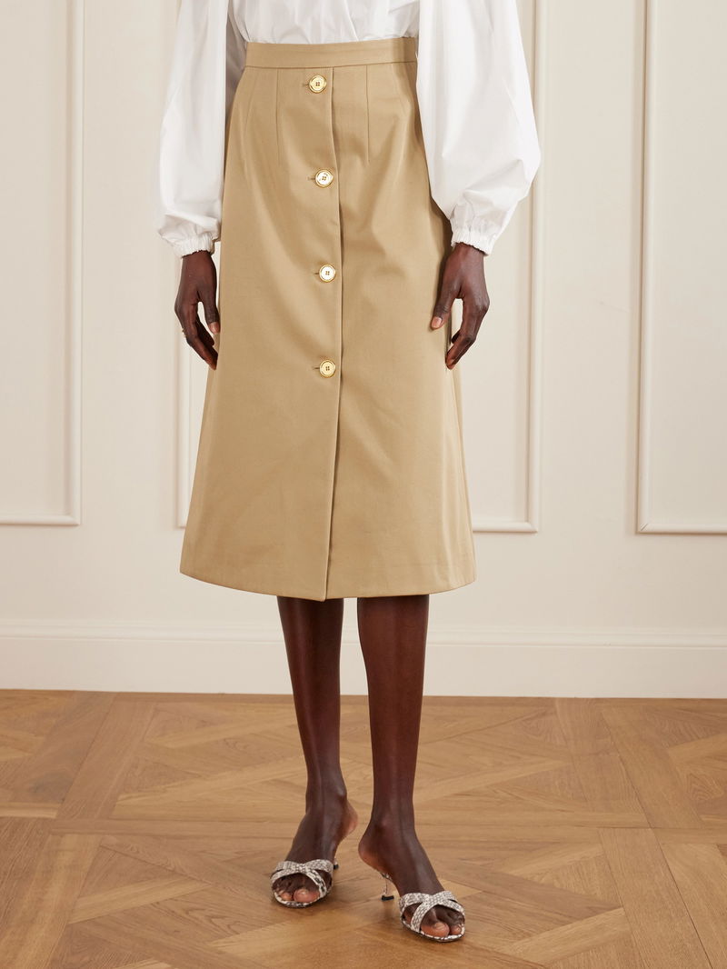 Patou's skirt is effortlessly classic. Tailored from cotton-twill, it's defined by a darted waist that flares to an elegant A-line hem. Match your jewelry to the gleaming gold-tone buttons.