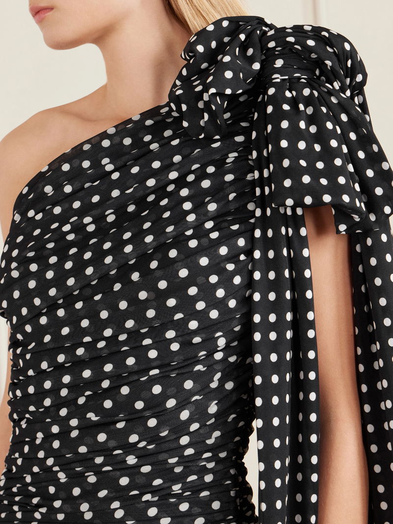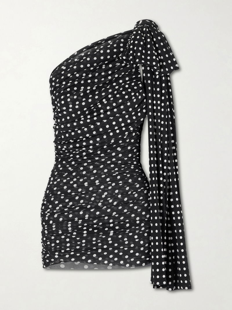 Patou's dress echoes the label's whimsical elegance. Made from jersey, it's speckled with polka dots and artfully gathered to a figure-skimming silhouette. The bow at the one-shoulder neckline drapes beautifully past the mini hemline.