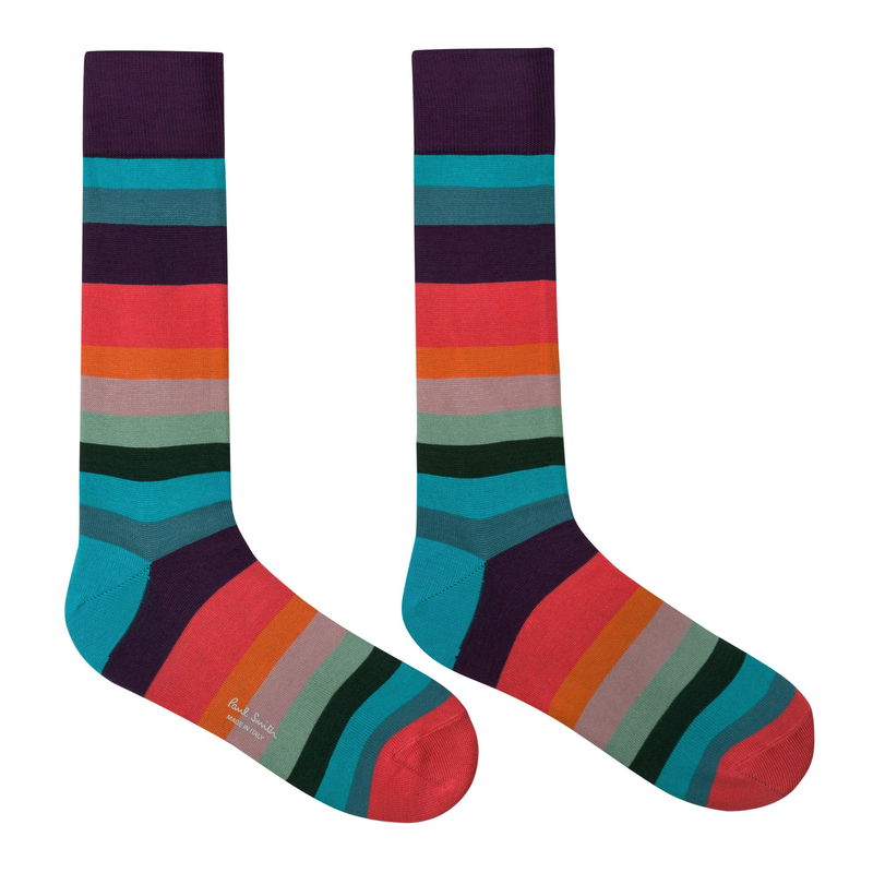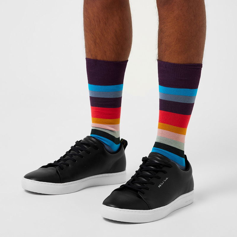 The Paul Smith Art Stripe Socks are a great addition to your everyday accessories, featuring a lightweight woven construction with a ribbed trim to the top along with flat lock stitching to the toes that ensures a comfortable fit for all day wear. A colourful stripe pattern along with the Paul Smith branding completes the look with a whimsical flair.