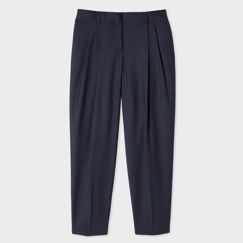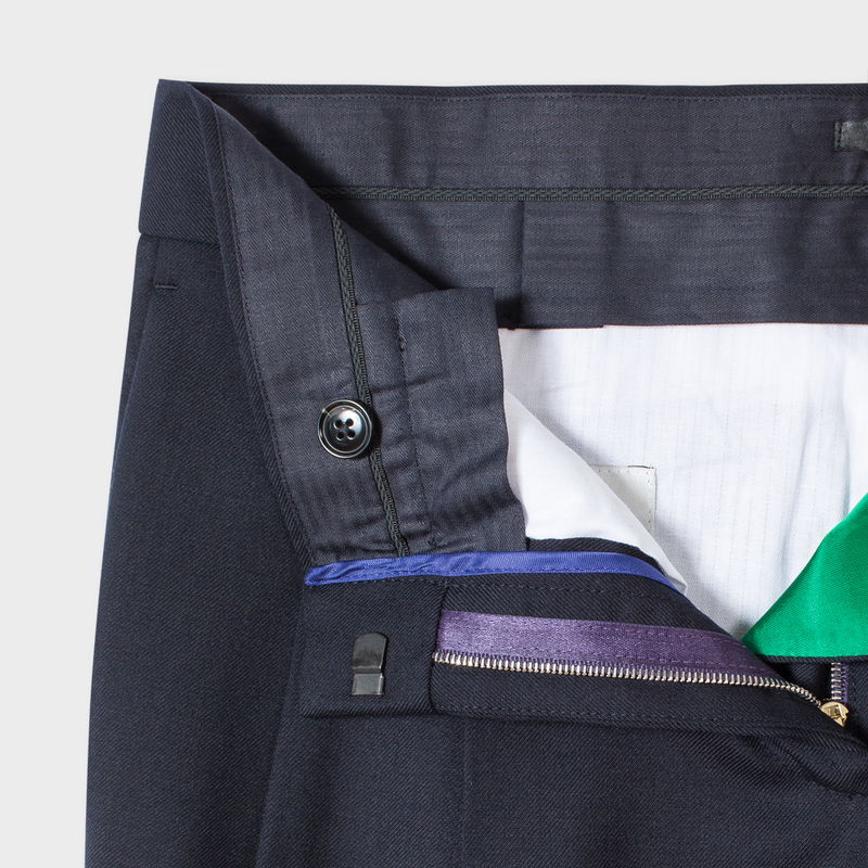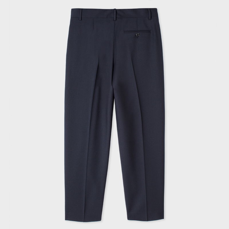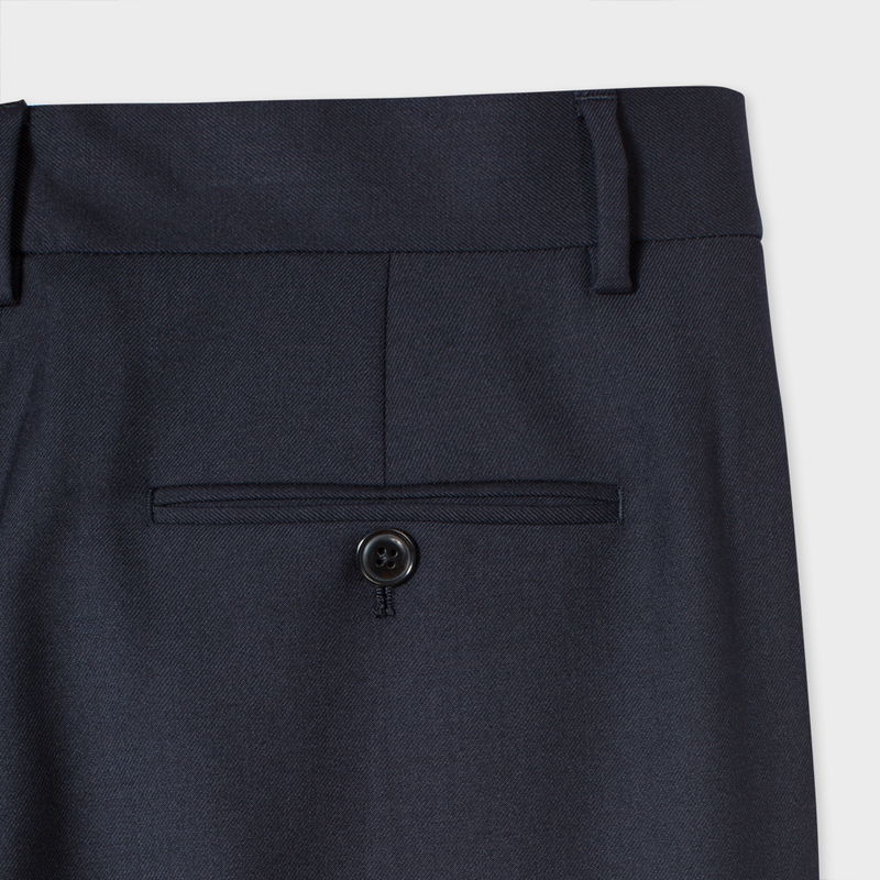 Made in Italy as part of the Paul Smith 'A Suit To Travel In' collection, these navy trousers are constructed using a high-twist 100% wool yarn to create a quick recovery, crease-resistant cloth; providing a versatile and highly-practical piece of tailoring. Finishing at the ankle for a modern, elegant silhouette, these pleated trousers come complete with colour-flash internal detailing and sustainable horn buttons throughout. The original 100% wool suit, which was recently described by The Times as ‘the world’s best business suit’, remains at the core of the collection.