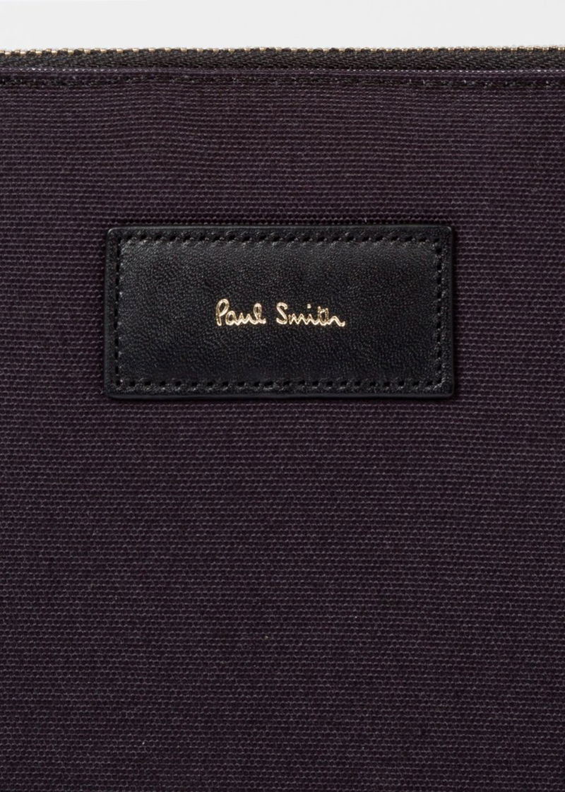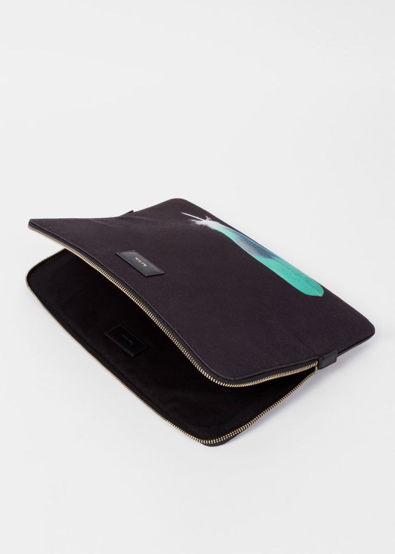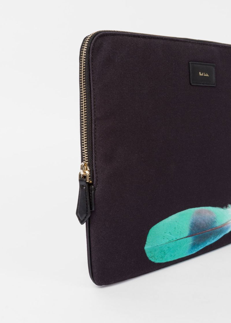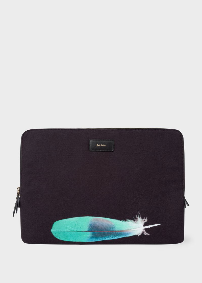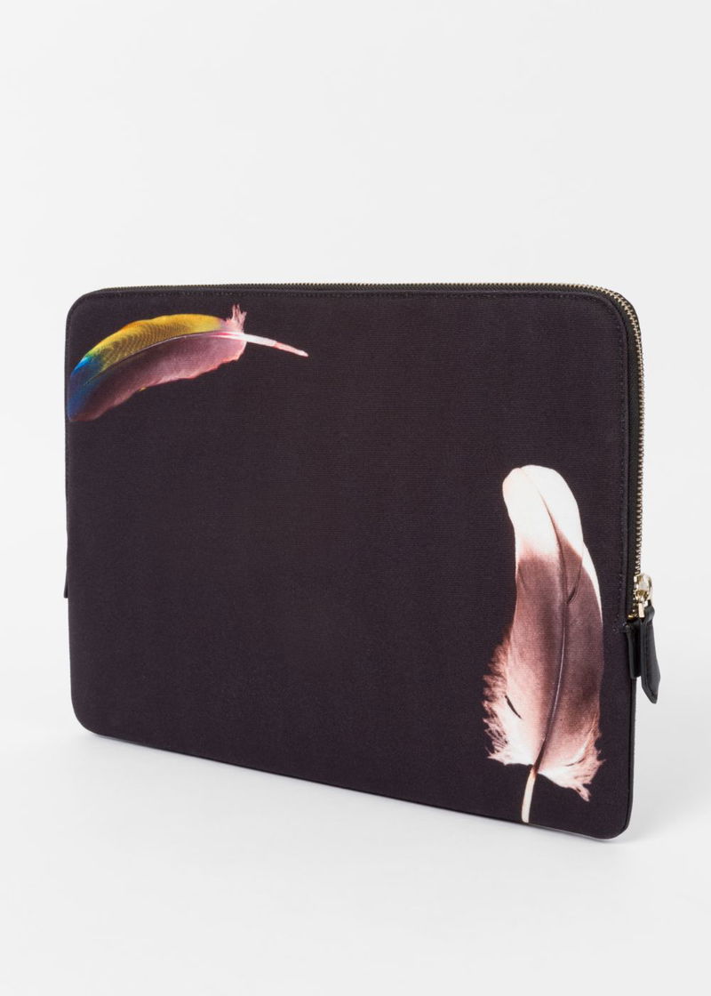 Black canvas 'Feather' print 13" laptop sleeve with a black lining and a zip closure. Designed to fit the 13" Apple Macbook. Gold hardware and leather zip-pull. Exterior gold foil Paul Smith signature embossed patch. Interior black Paul Smith signature embossed patch. A black Paul Smith dust bag is included.