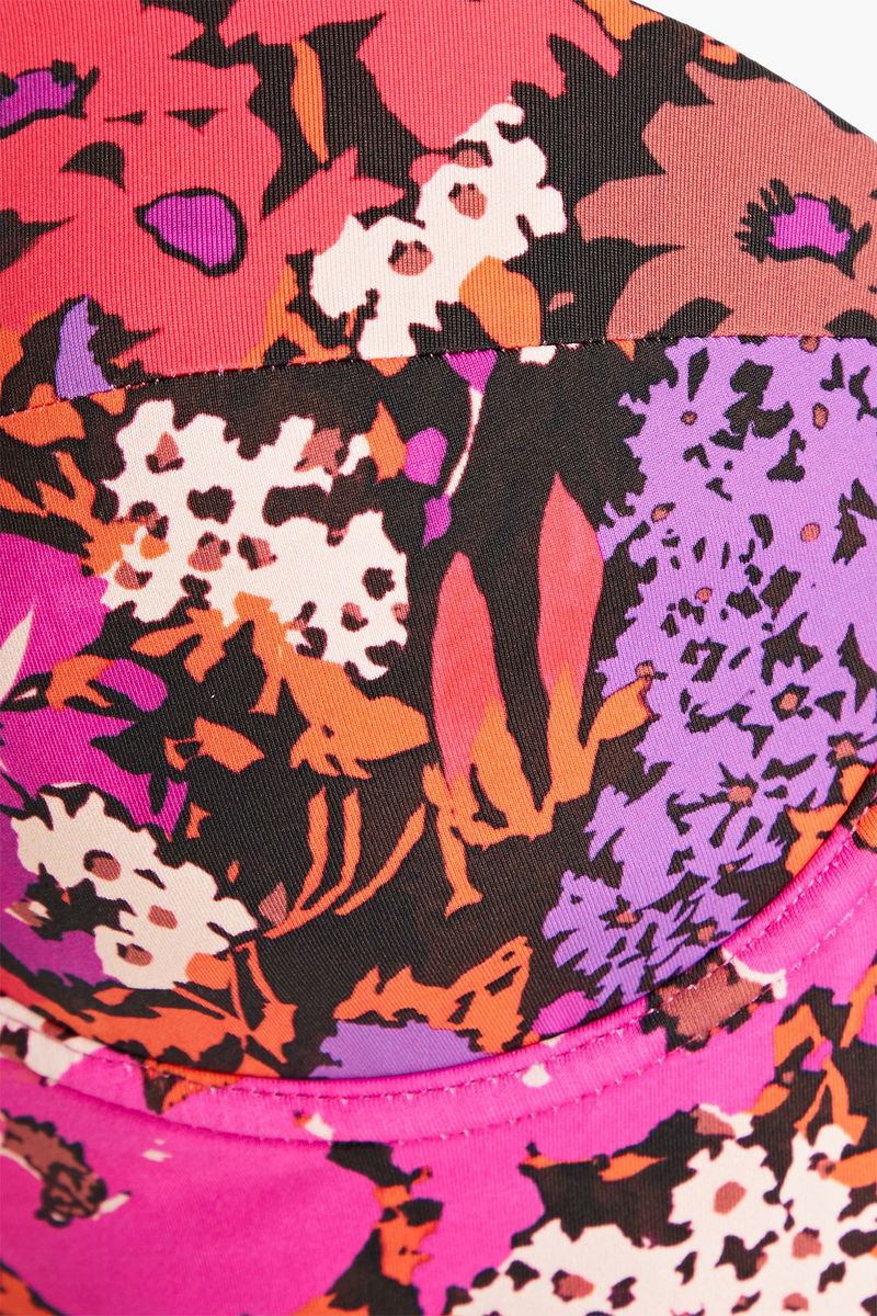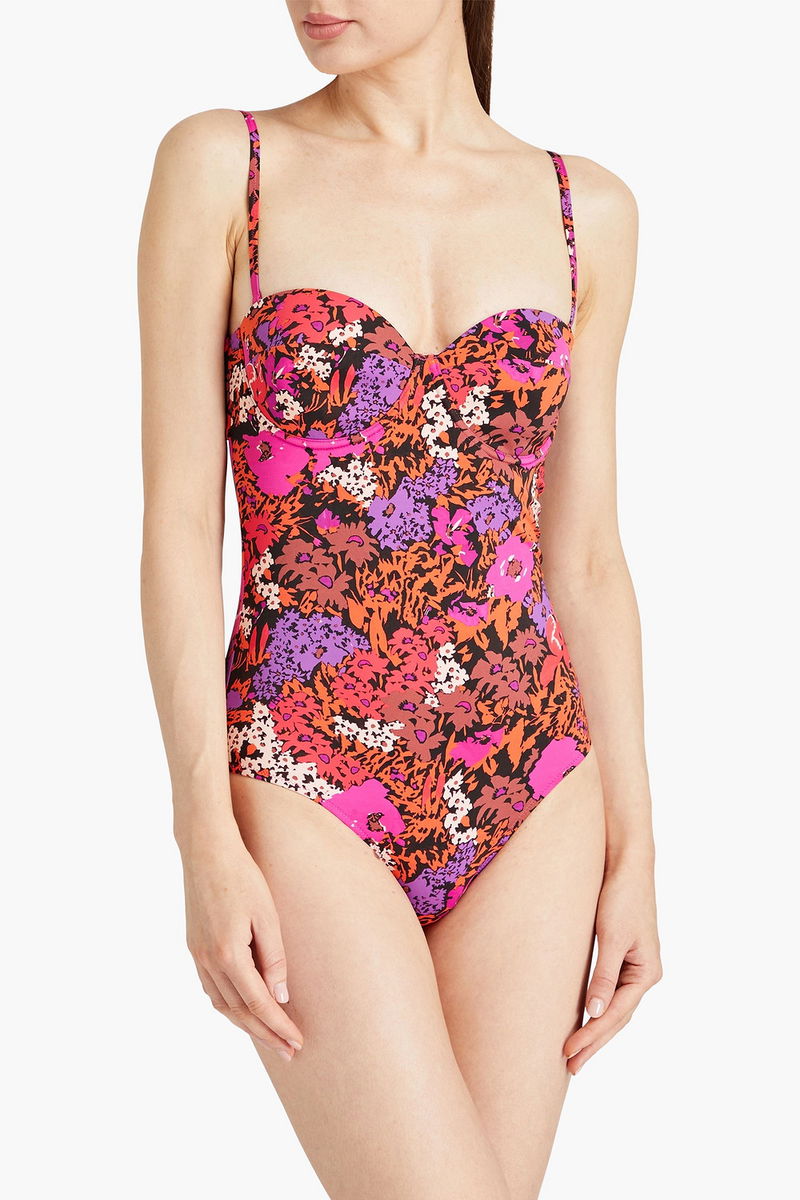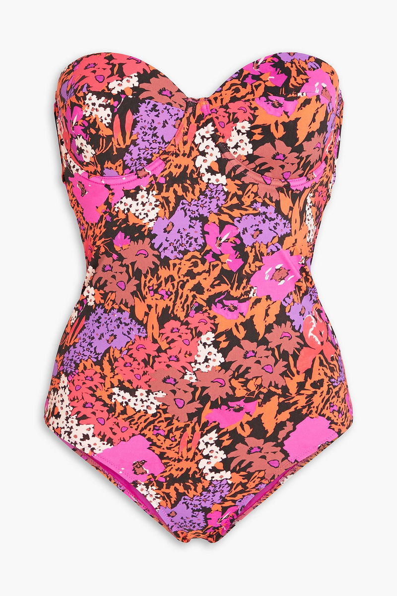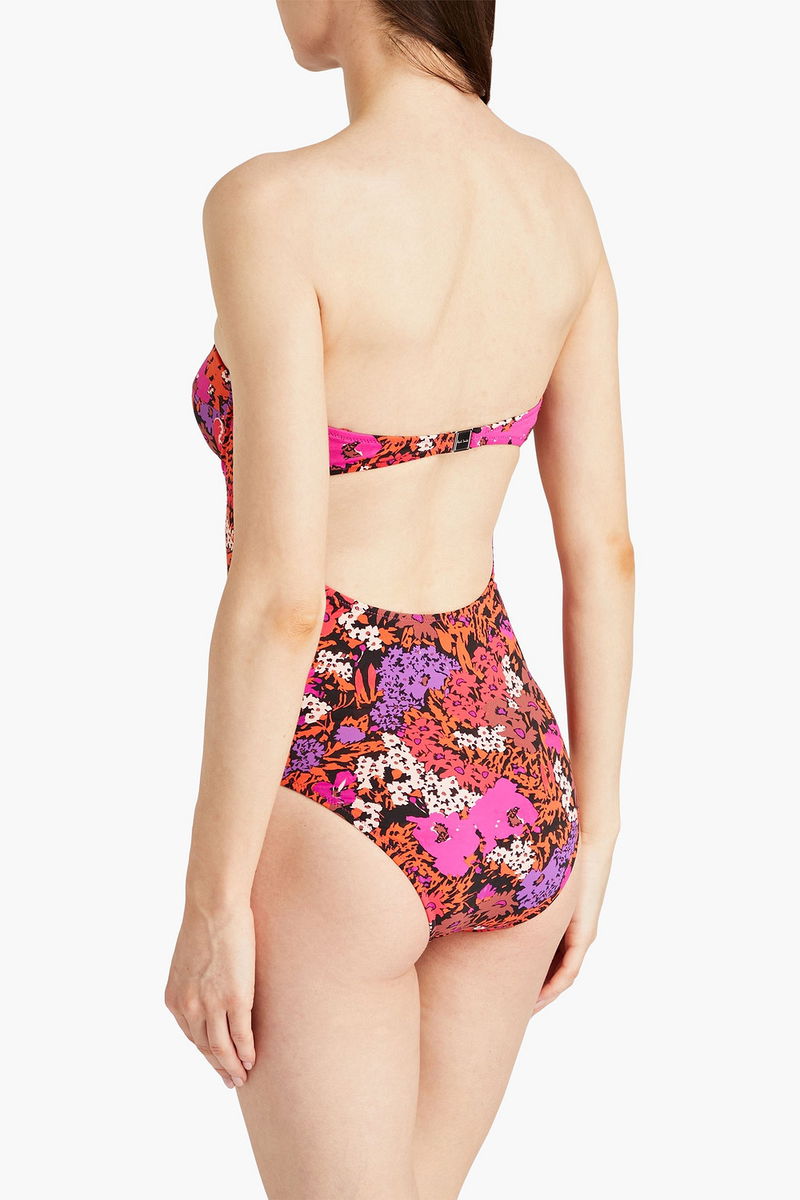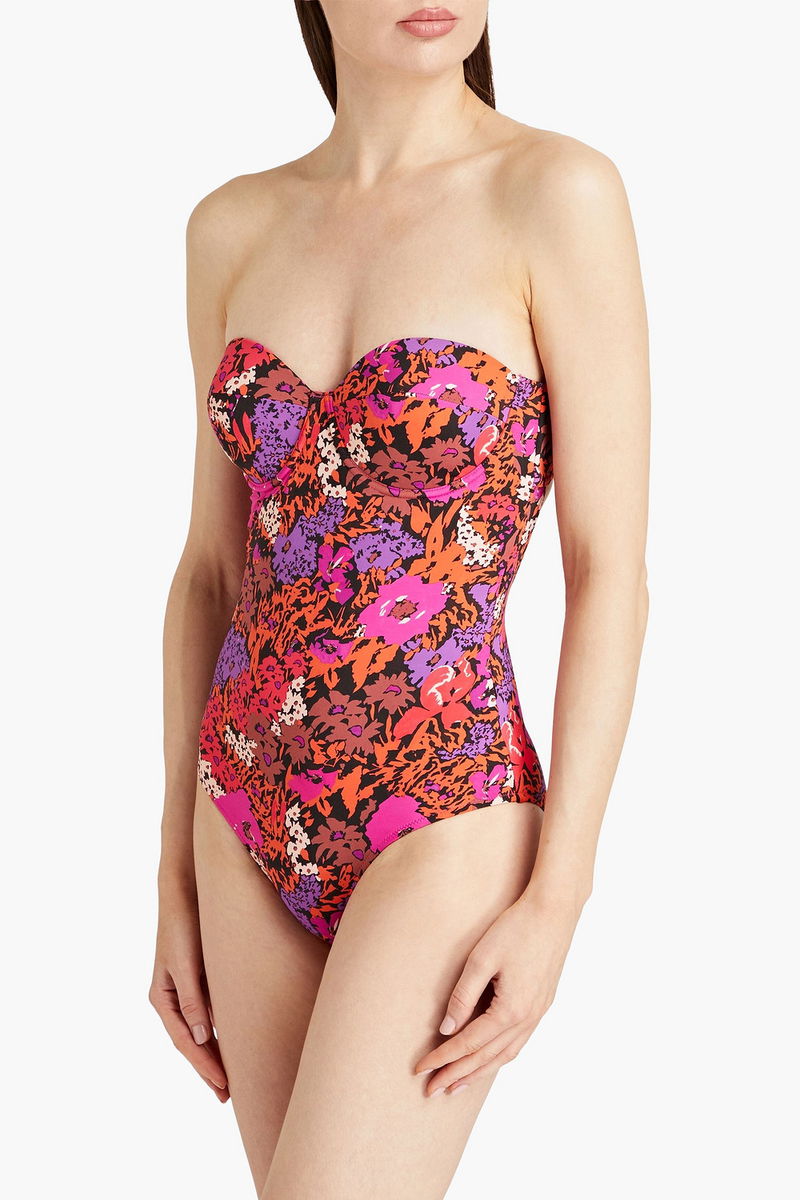 Bandeau swimsuit, Underwired cups, Floral-print, Stretch-polyamide, Detachable shoulder straps, Clasp fastening at back.