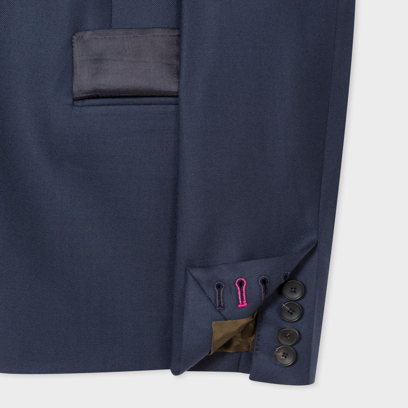 Constructed from 100% dry handle wool-hopsack cloth with crease-resistant properties, this navy one-button blazer features a notched lapel with vibrant fuchsia Melton wool under-collar. This classic single-vent jacket is expertly finished with panelled colour-flash linings - complete with 'Celestial' print detailing.
