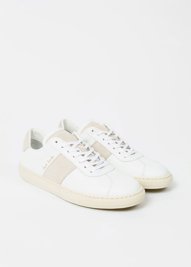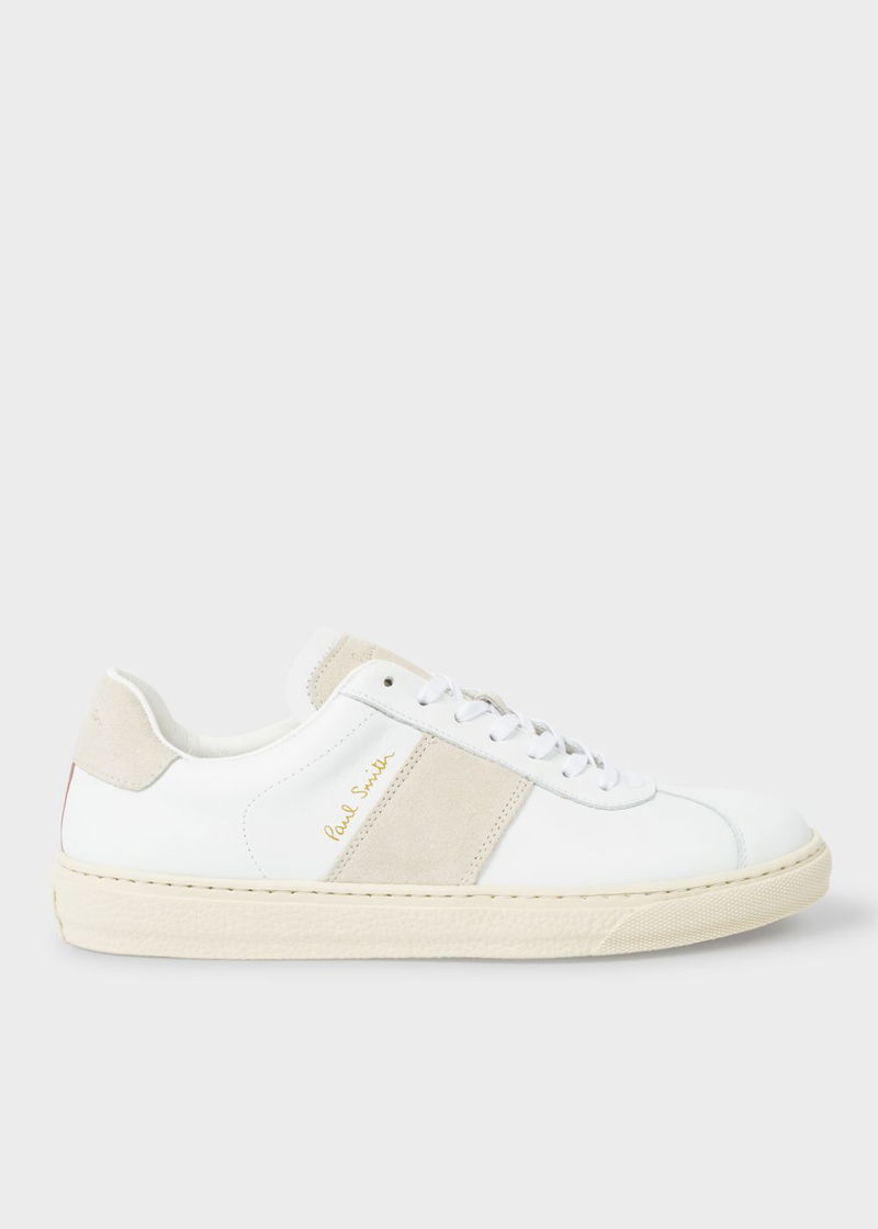 Crafted from premium leather, these white 'Levon' trainers feature smooth ecru suede side panels, complimented by a gold foil-embossed Paul Smith signature on the outside of each shoe. Complete with embossed ecru suede heel panels, these luxurious trainers are finished with off-white rubber soles with contrasting natural tread.