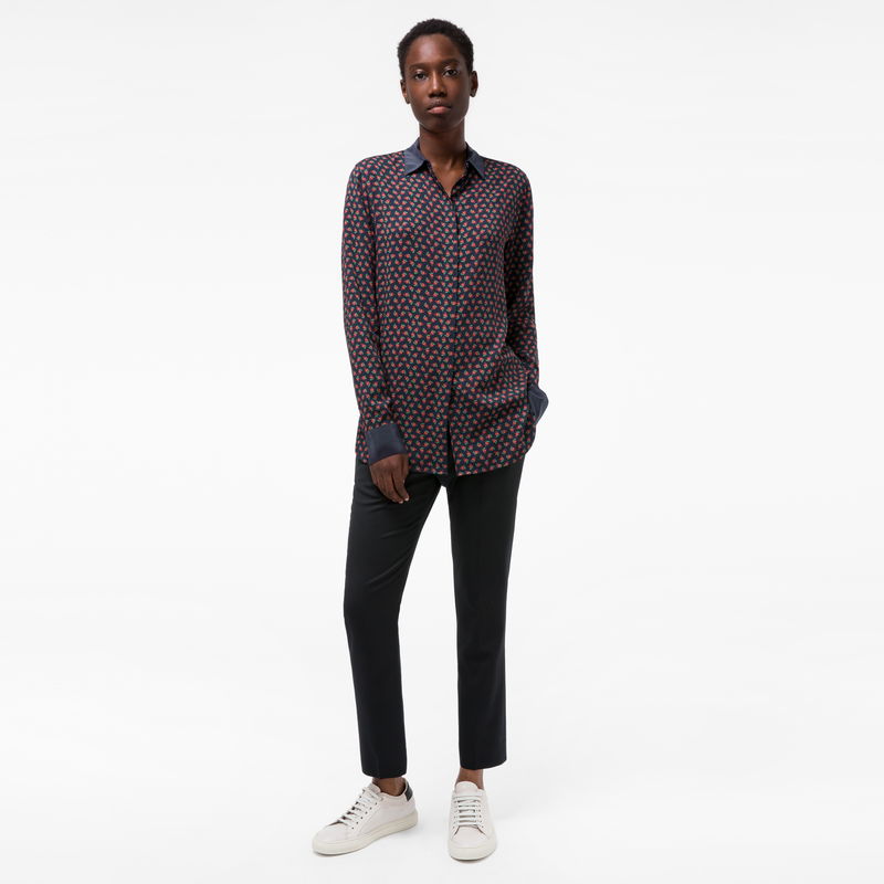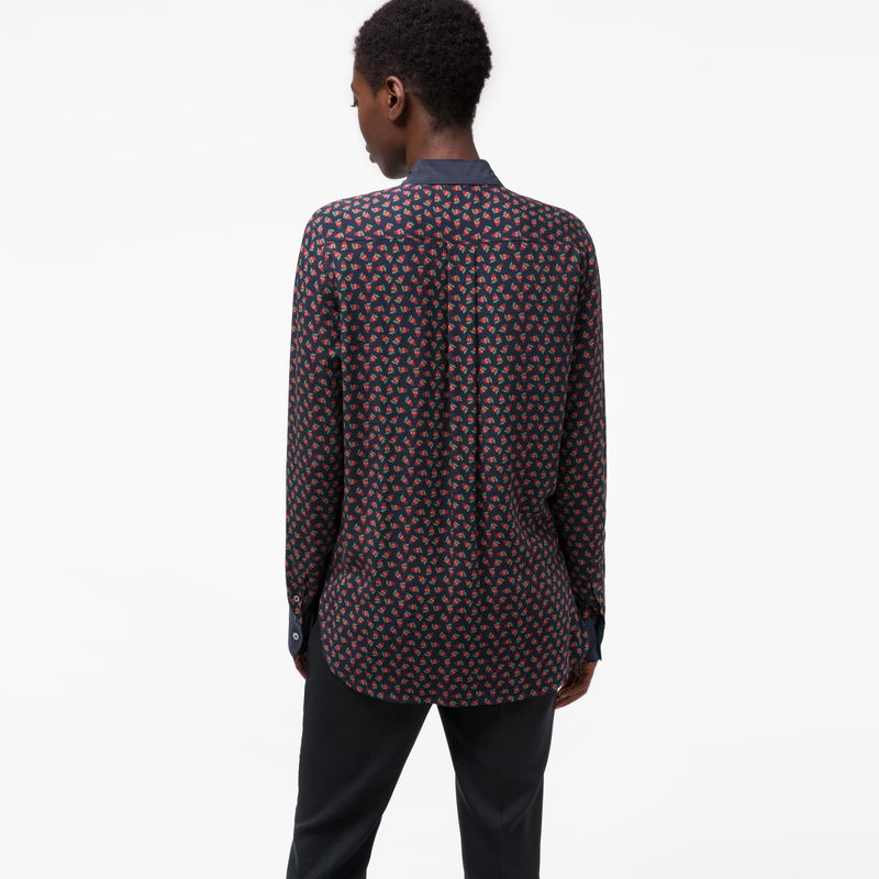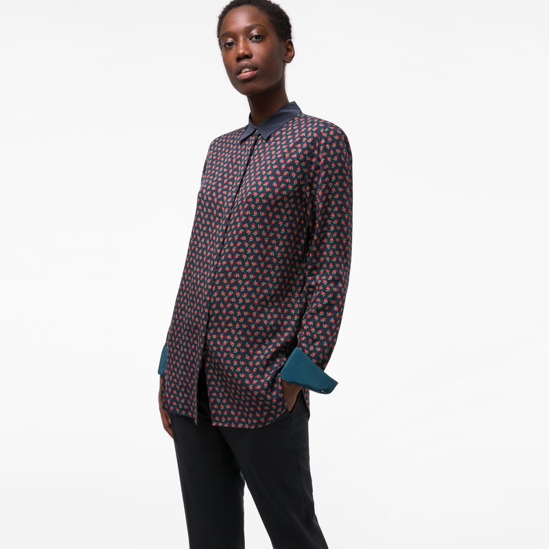 Made in Italy from premium viscose cloth with superior drape, this long-sleeved navy shirt features a playful 'Strawberry Skull' motif throughout. Cut with a silk-blend navy collar and concealed placket for a refined silhouette, the piece is expertly finished with grey shell buttons.