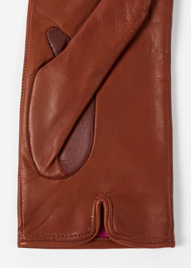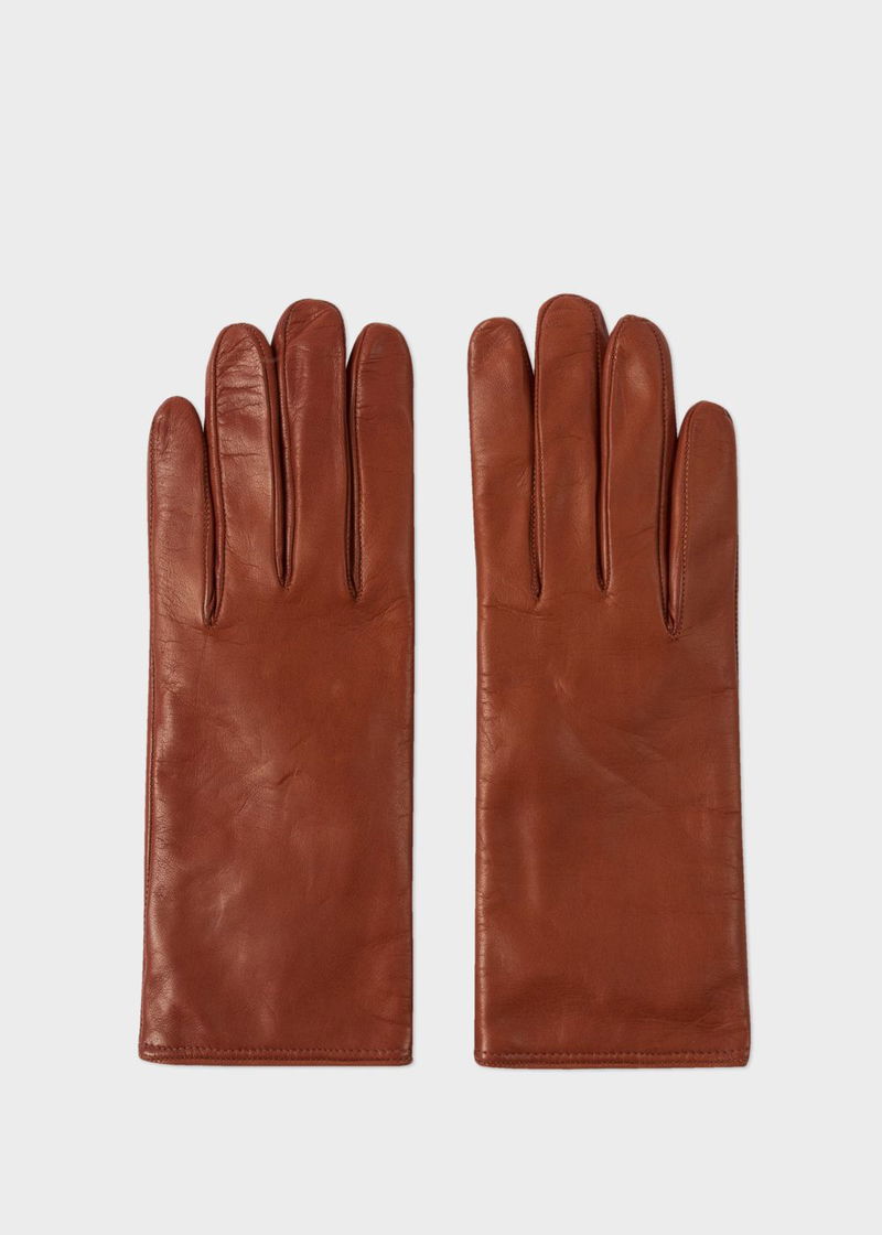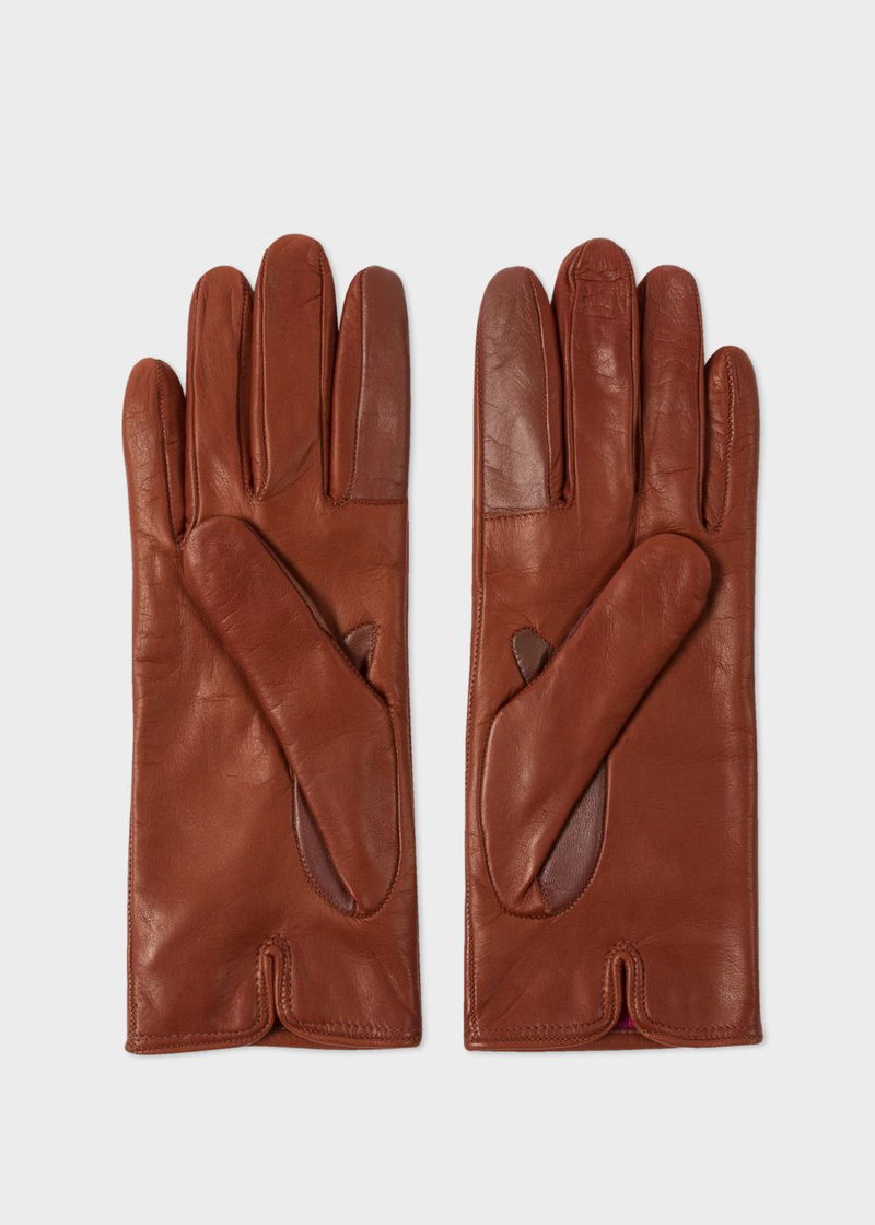 Women's tan lamb leather gloves with touchscreen capability. Made in Italy, these gloves are finished with a pink cashmere lining.